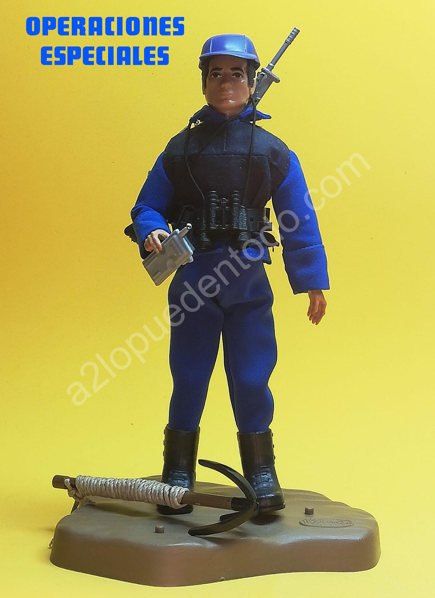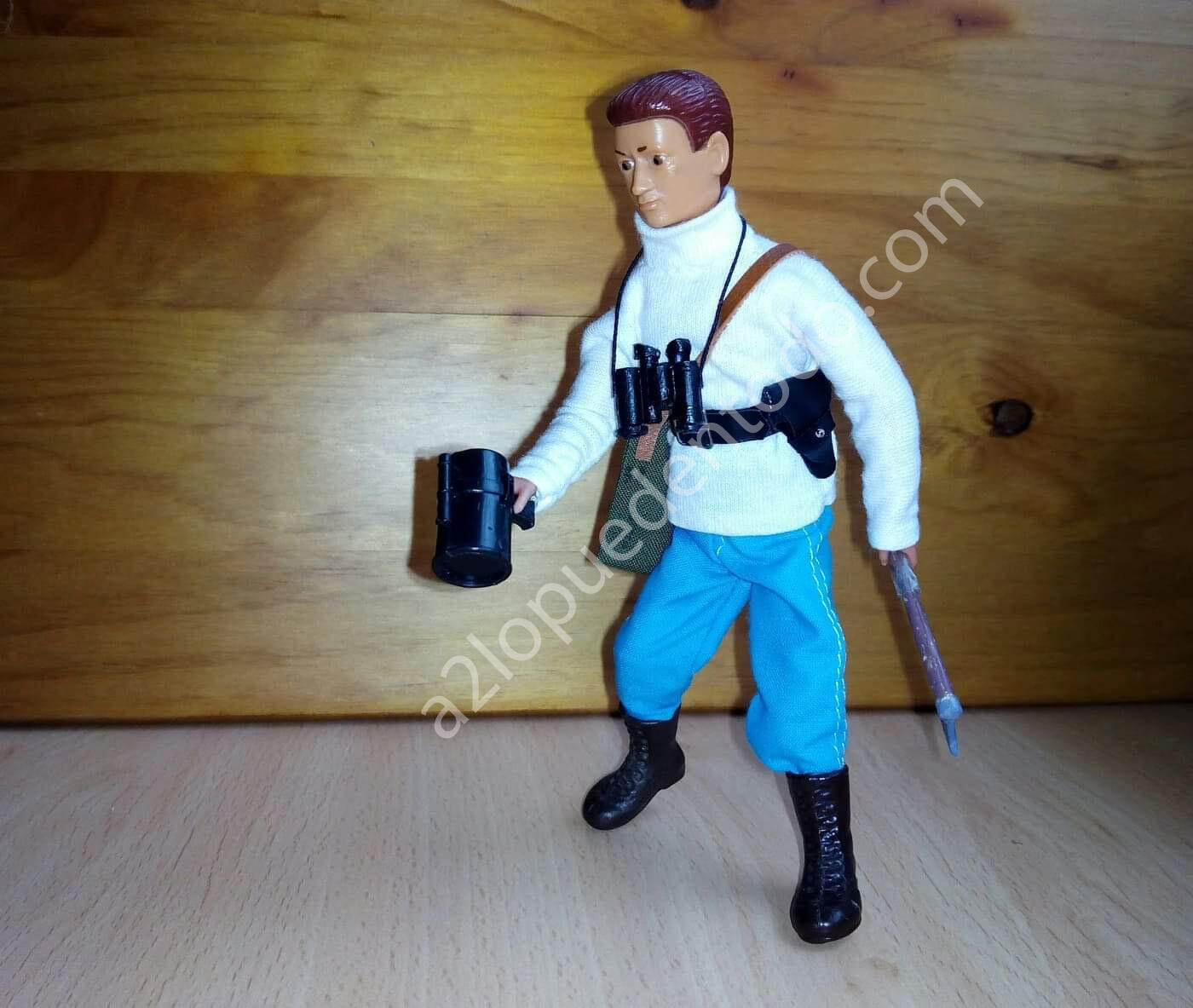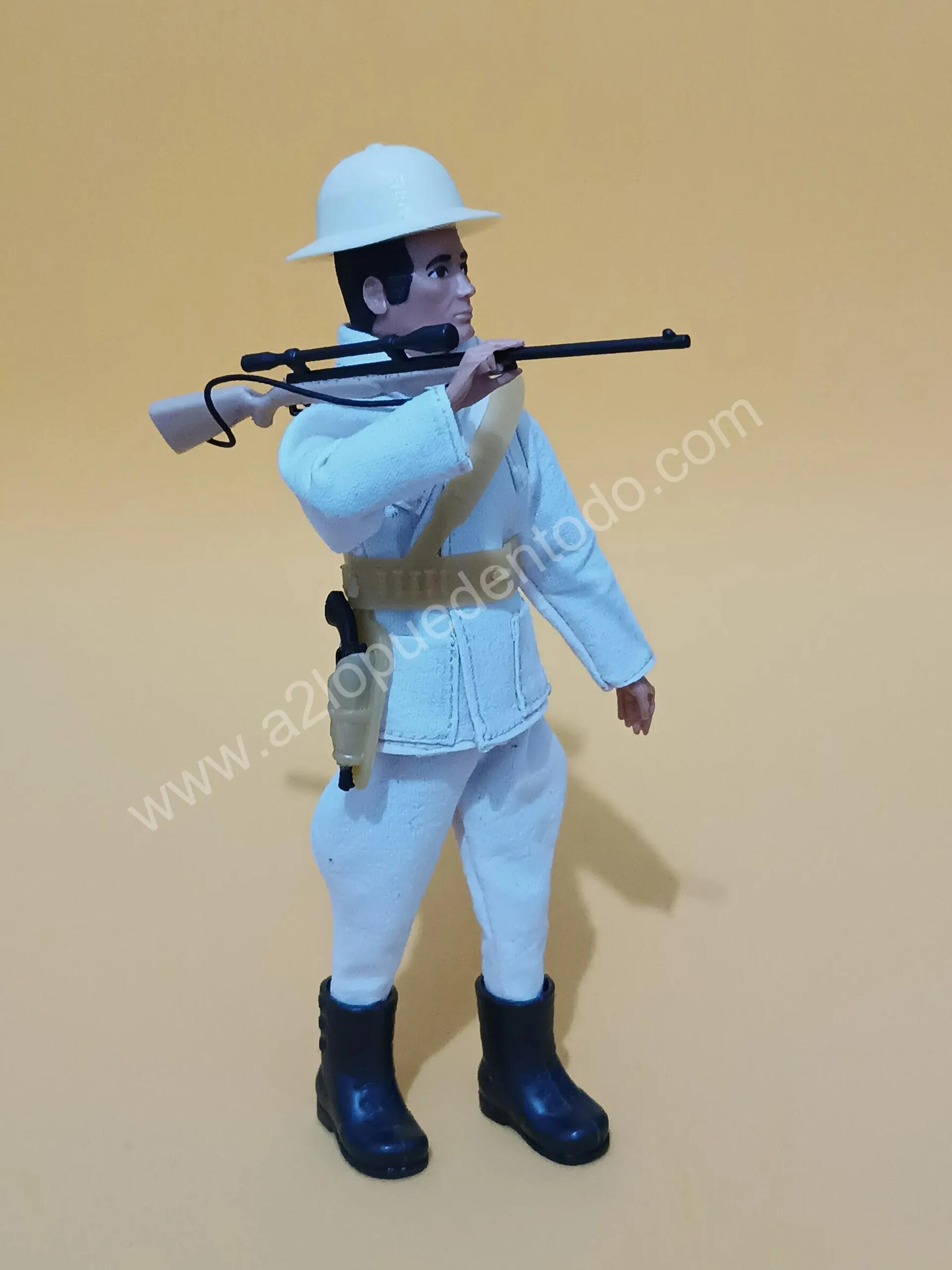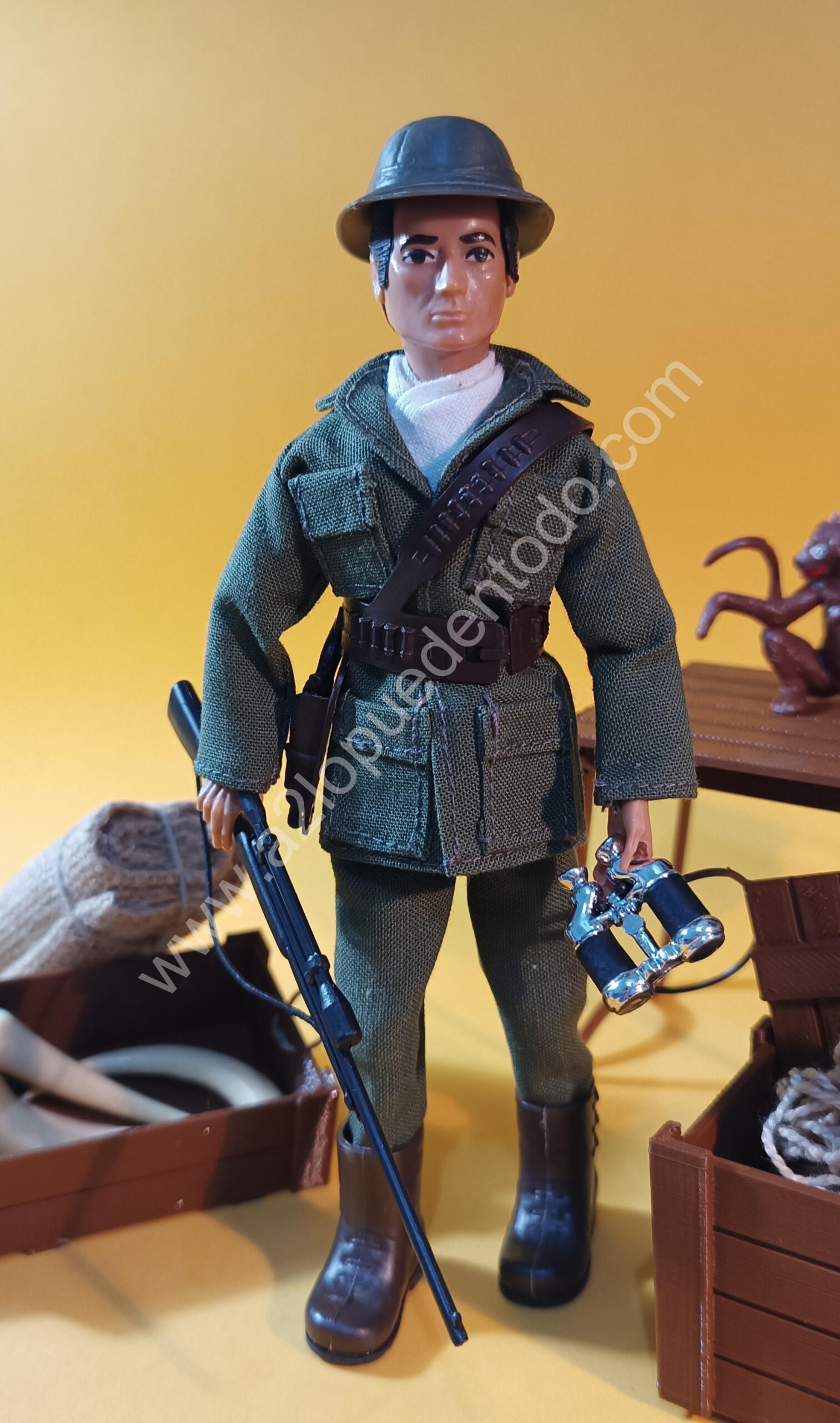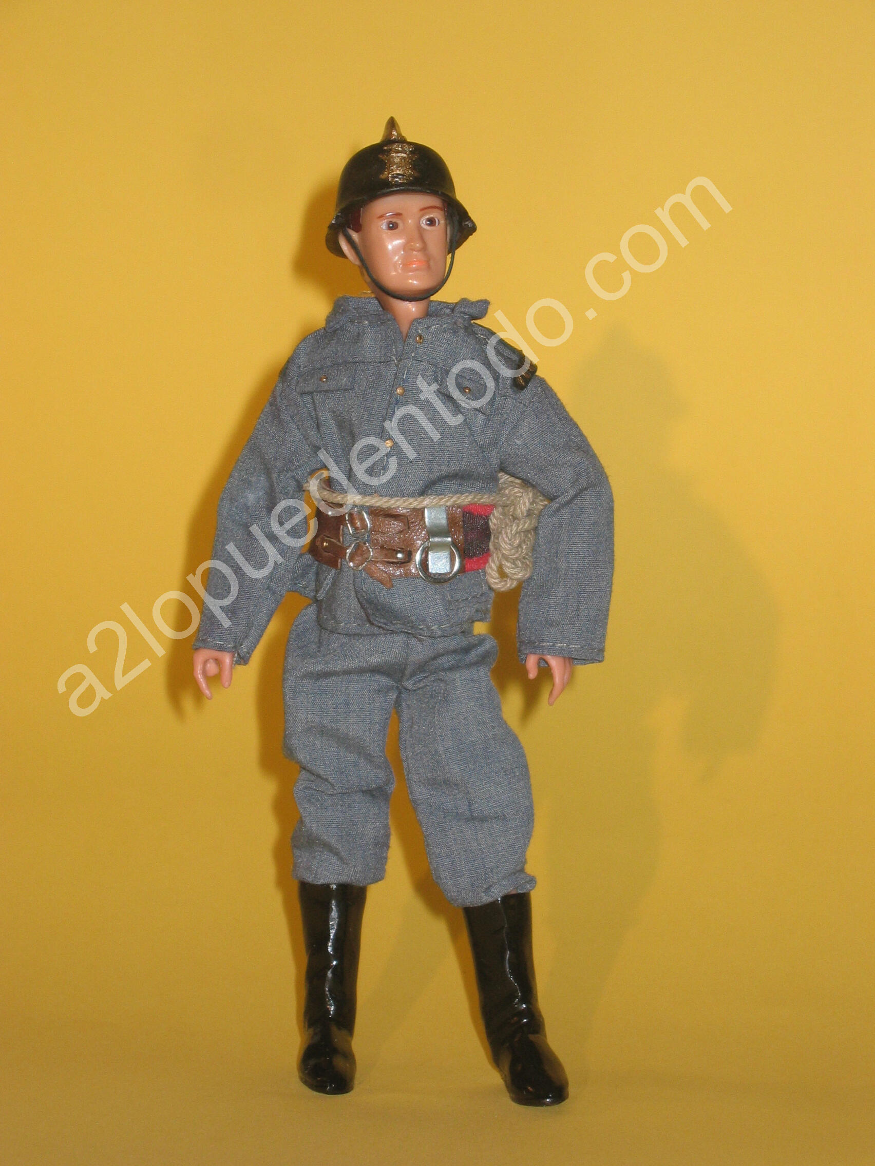 Ropa cosida a medida sobre maniquí reinyectado. Botas, walkie talkie, cetme y prismáticos reinyectados. Gorra y garfio con cuerda Altaya.