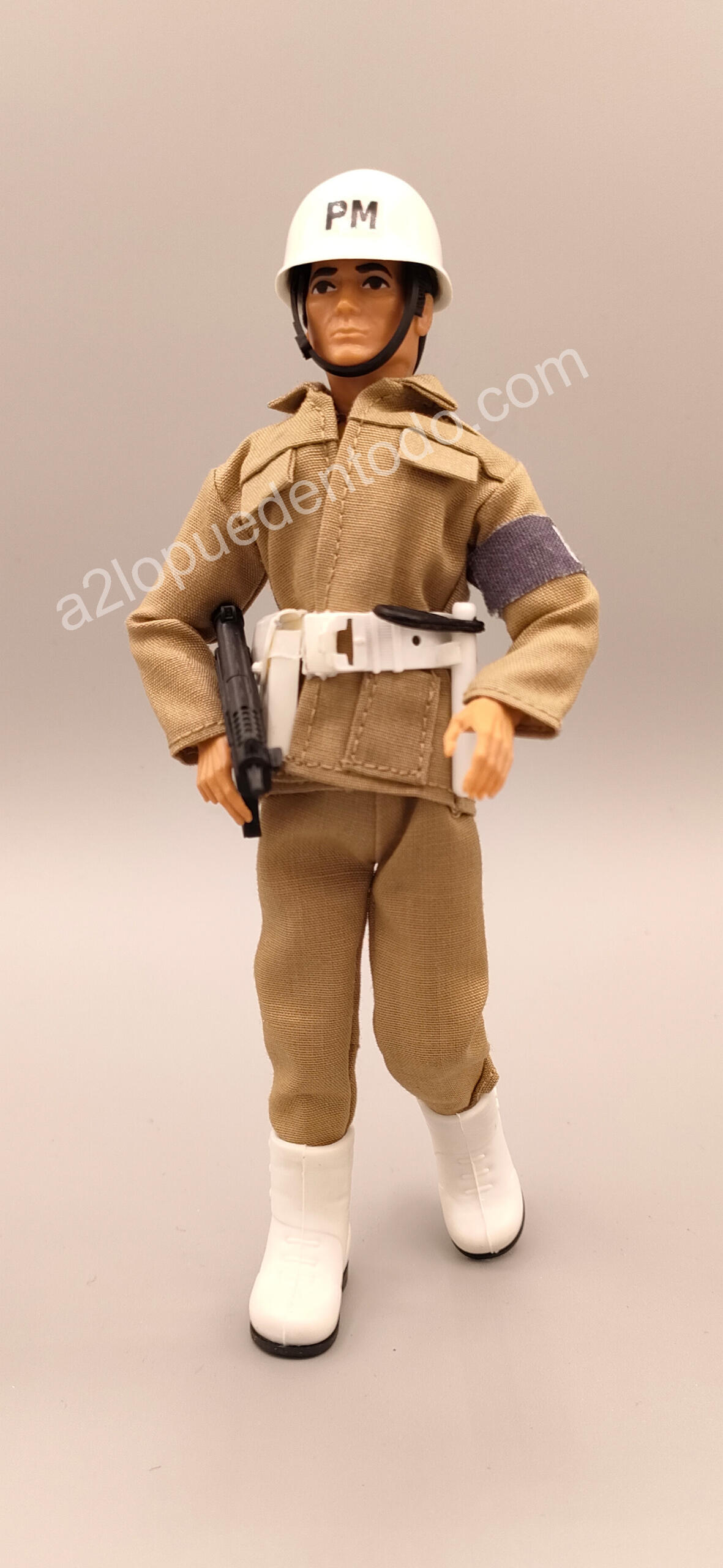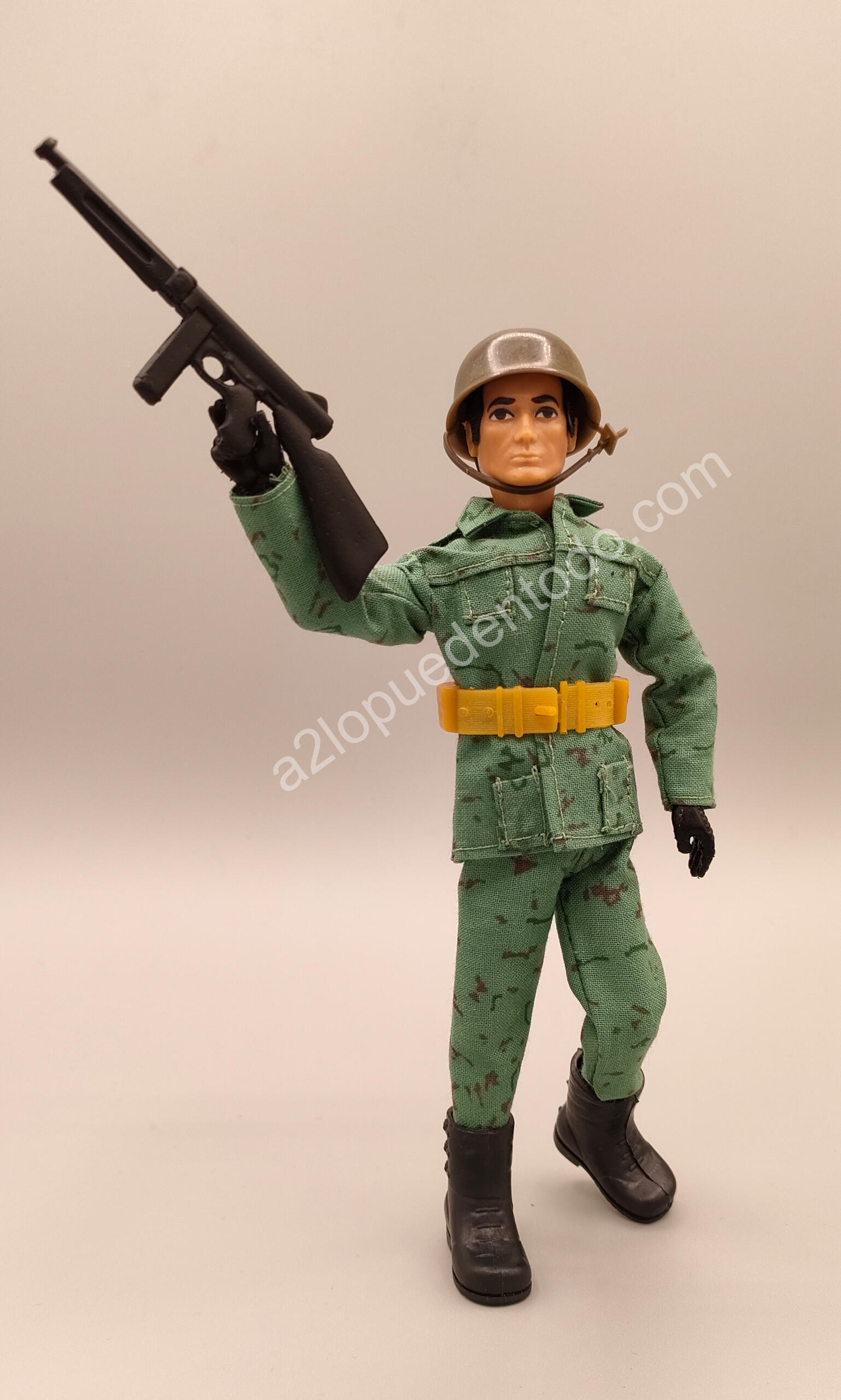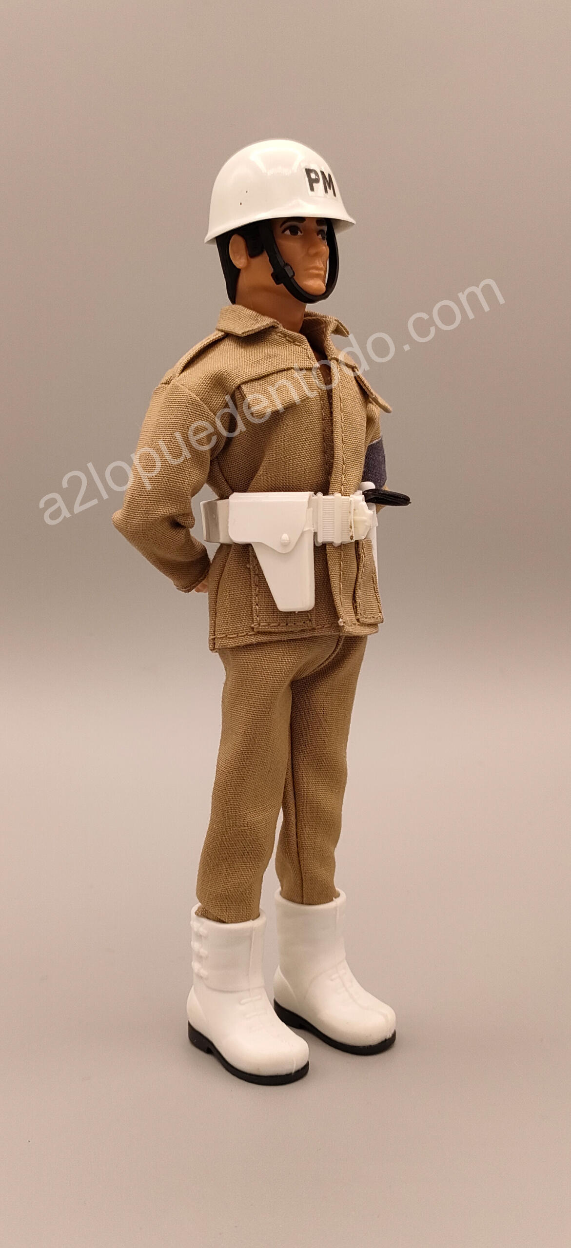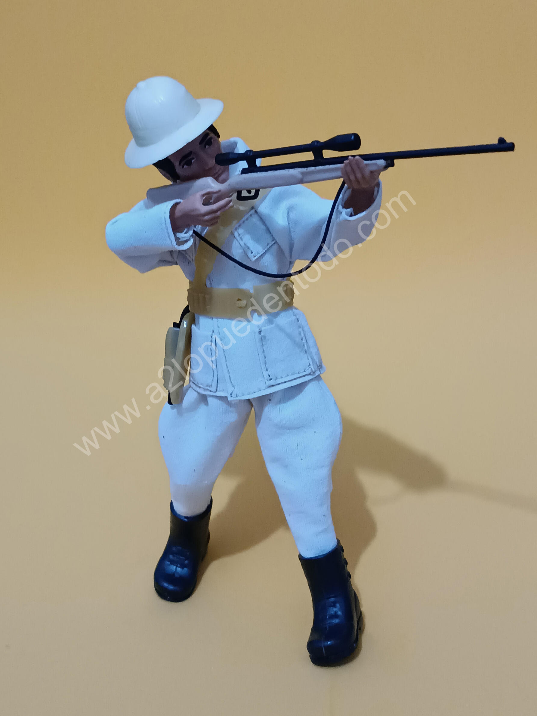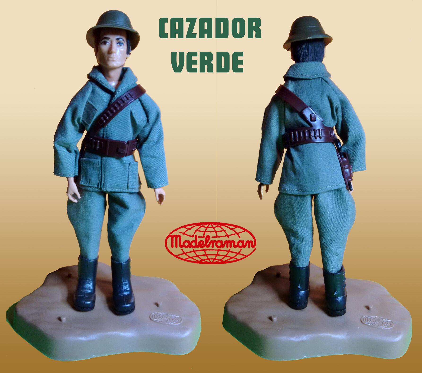 Ropa cosida a medida sobre maniquí reinyectado. Botas, walkie talkie, cetme y prismáticos reinyectados. Gorra y garfio con cuerda Altaya.