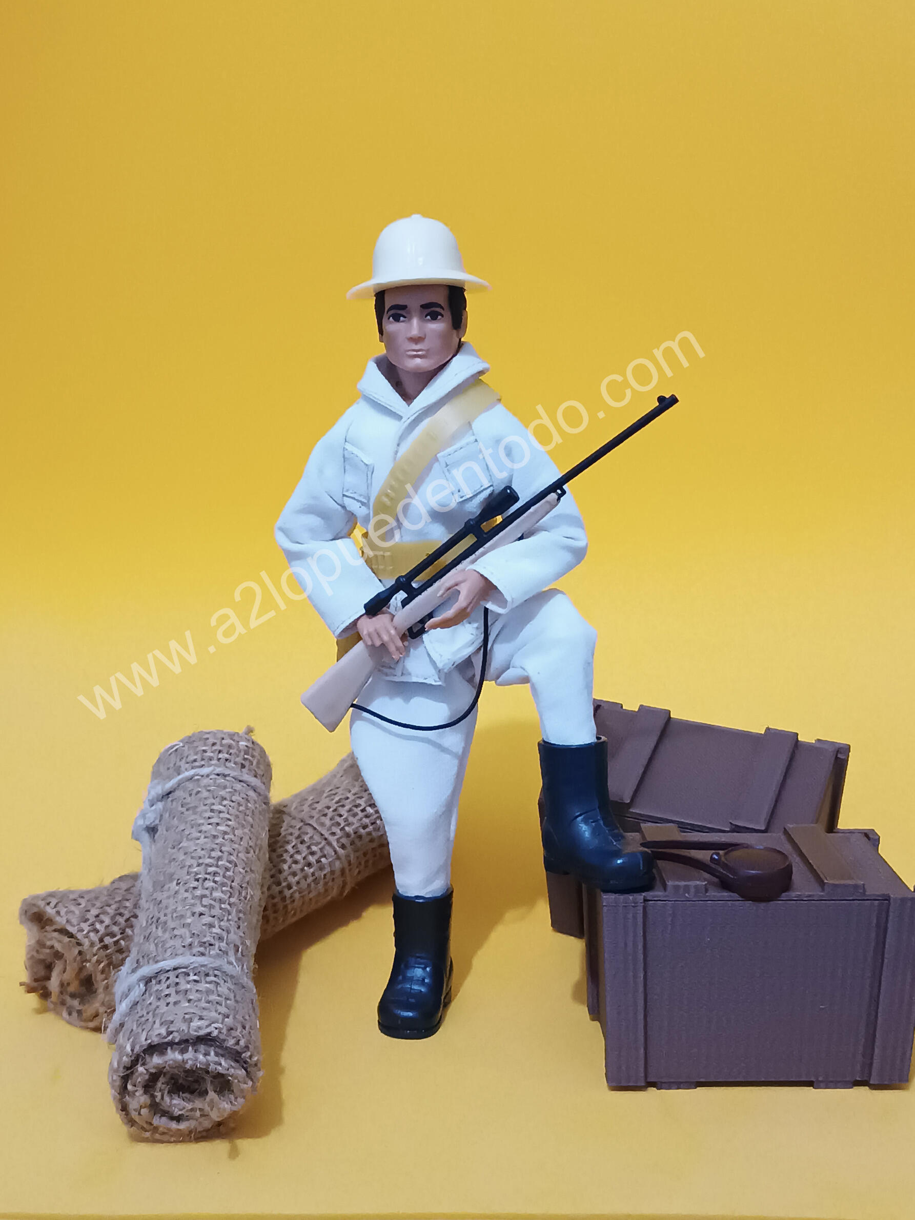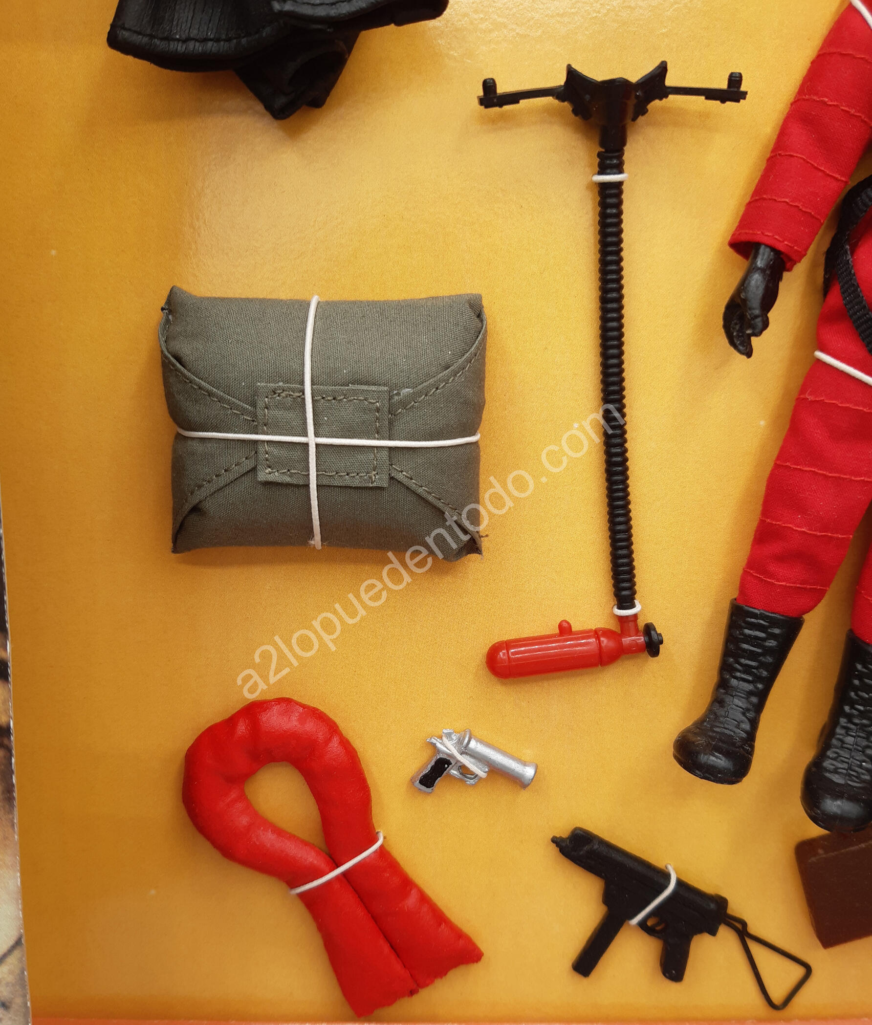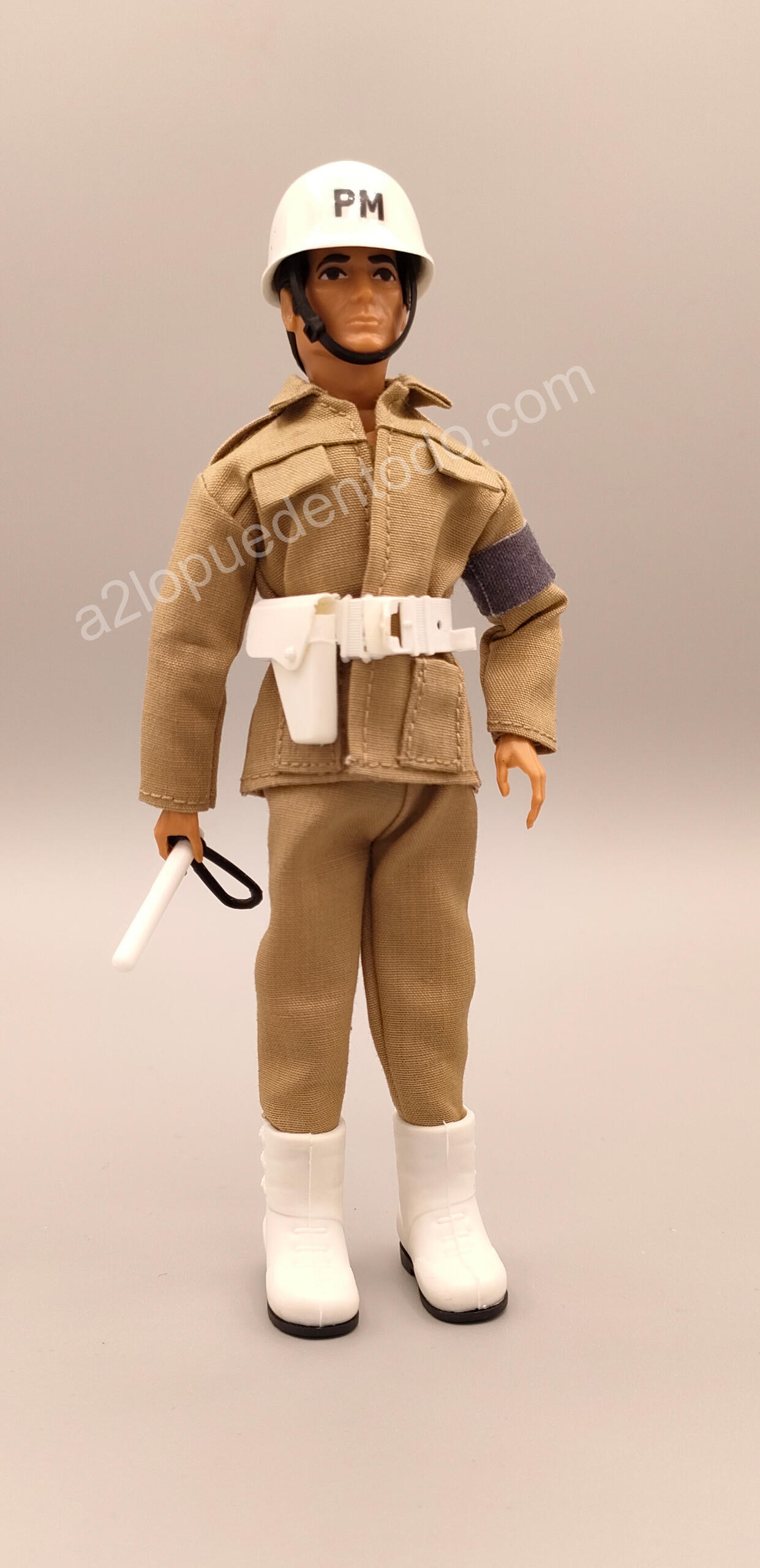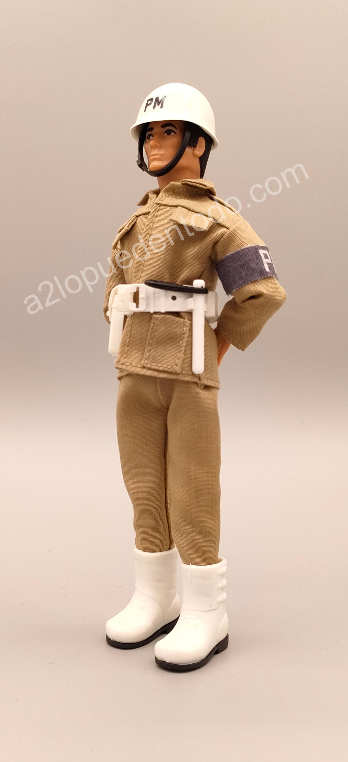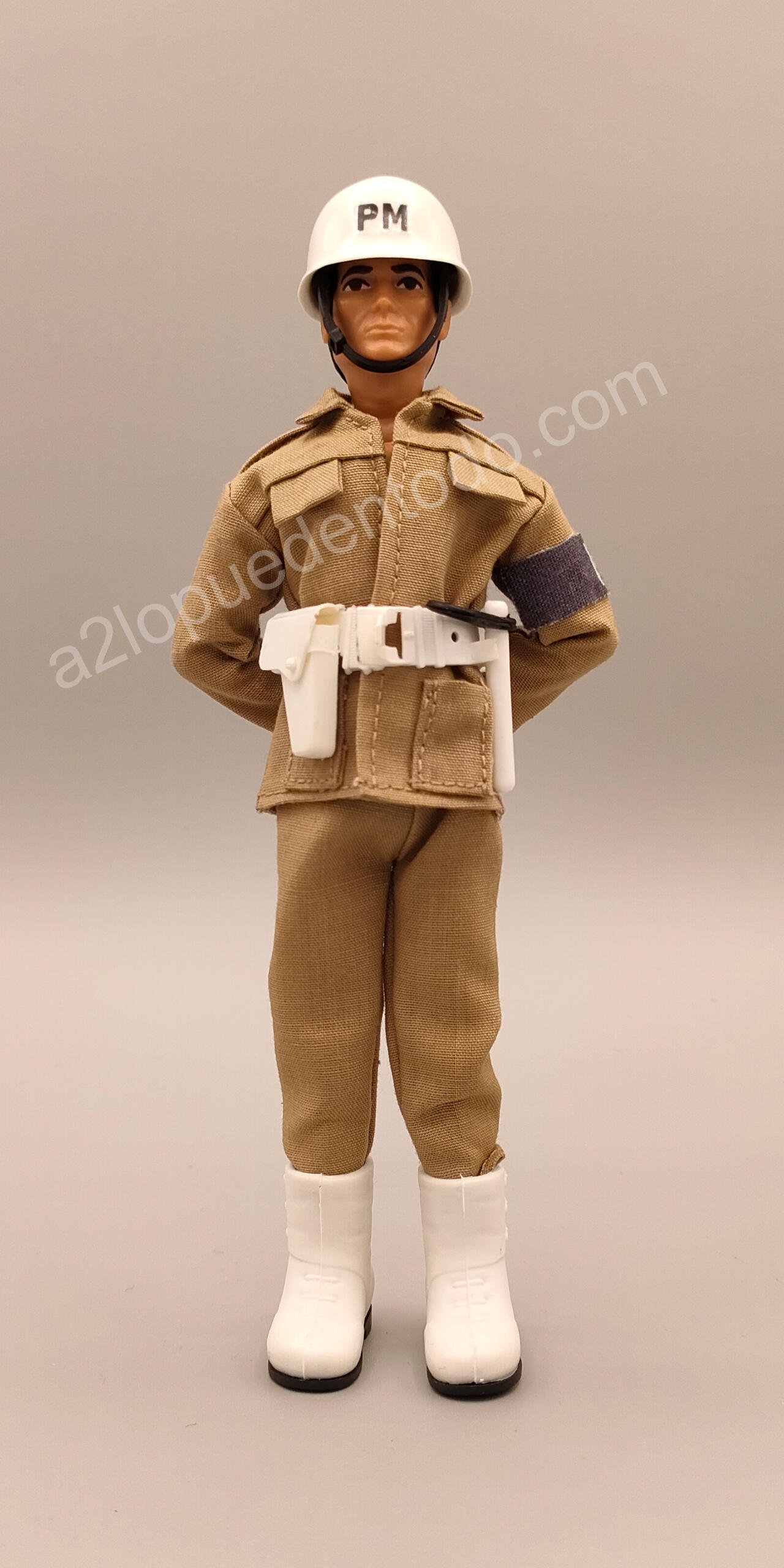 Ropa cosida a medida sobre maniquí reinyectado. Botas, walkie talkie, cetme y prismáticos reinyectados. Gorra y garfio con cuerda Altaya.