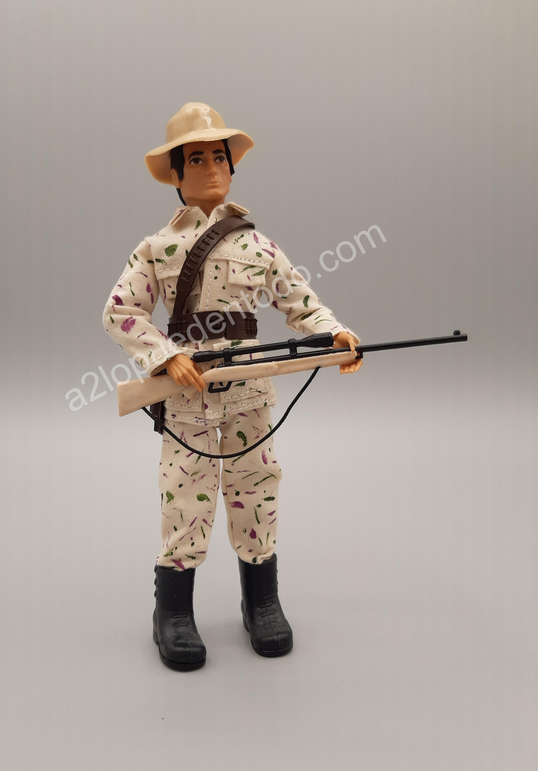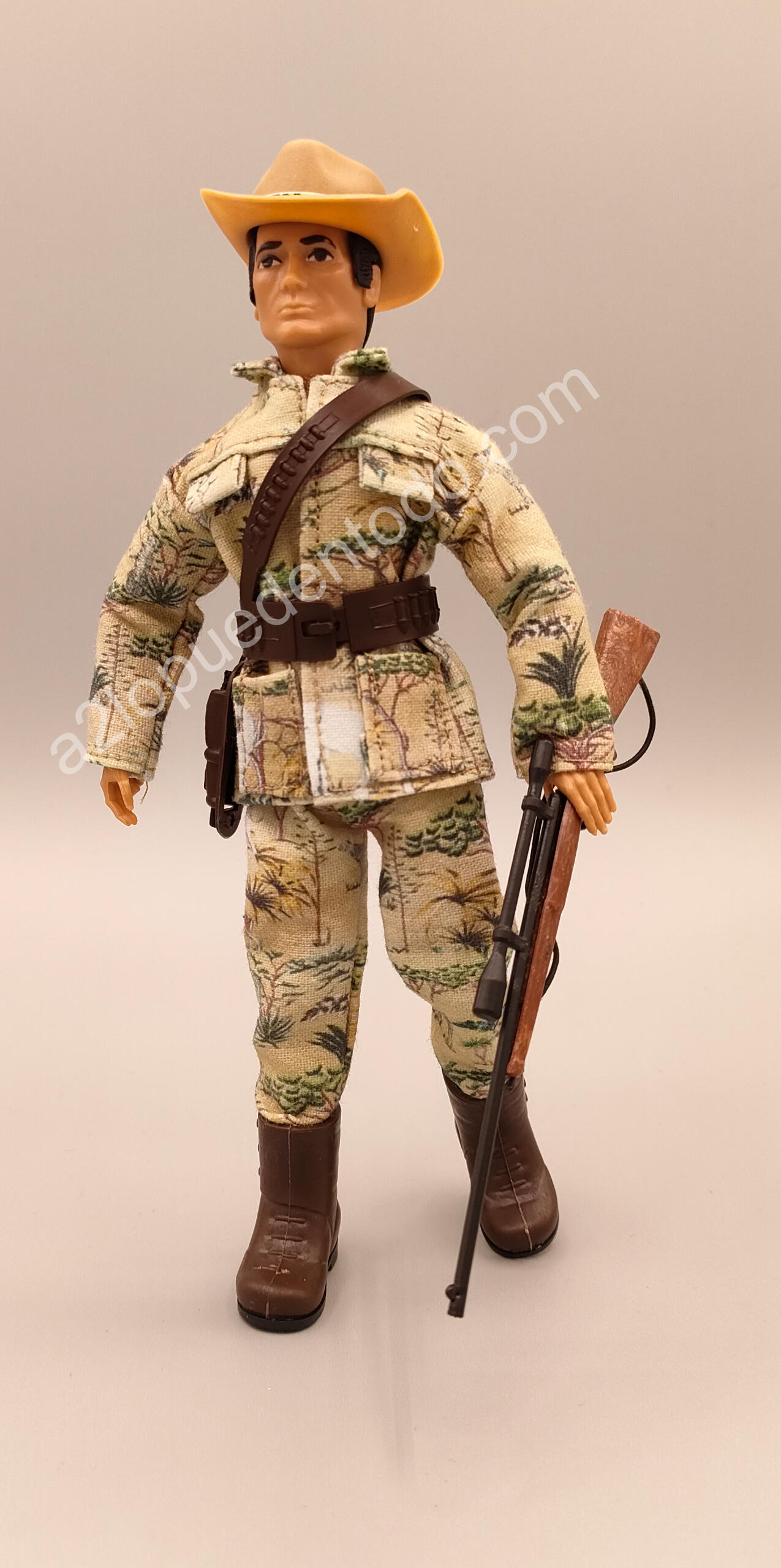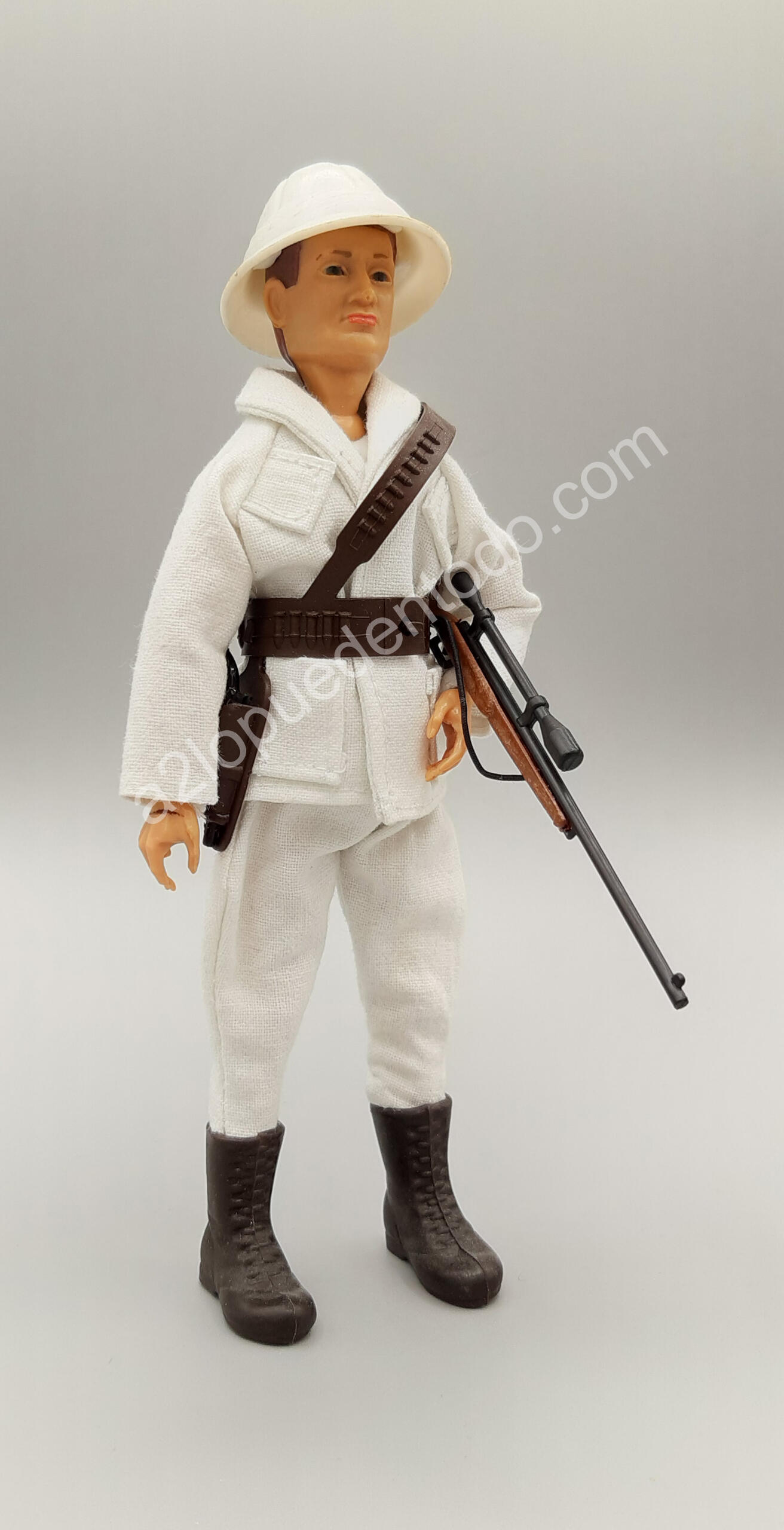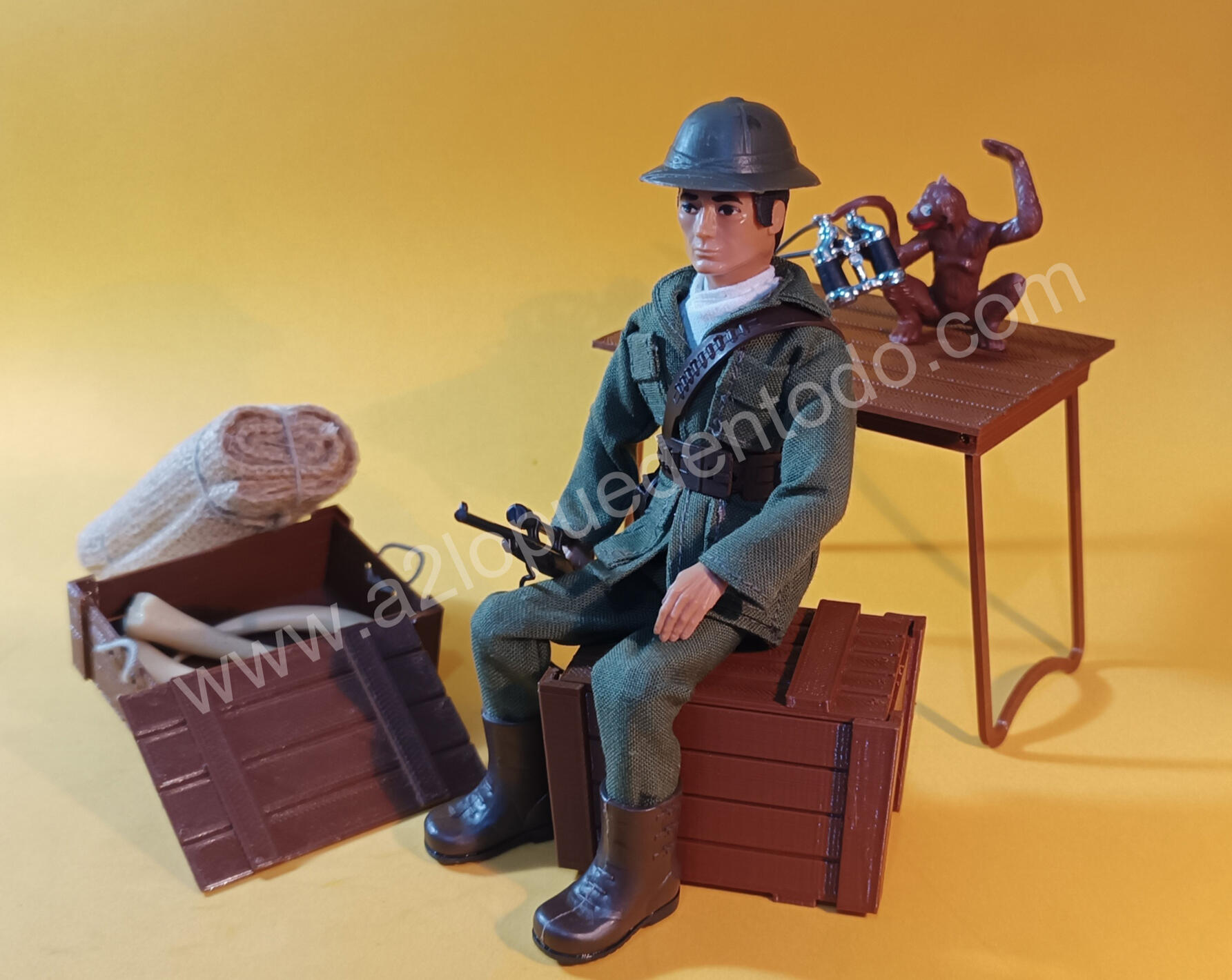 Ropa cosida a medida sobre maniquí reinyectado. Botas, walkie talkie, cetme y prismáticos reinyectados. Gorra y garfio con cuerda Altaya.
