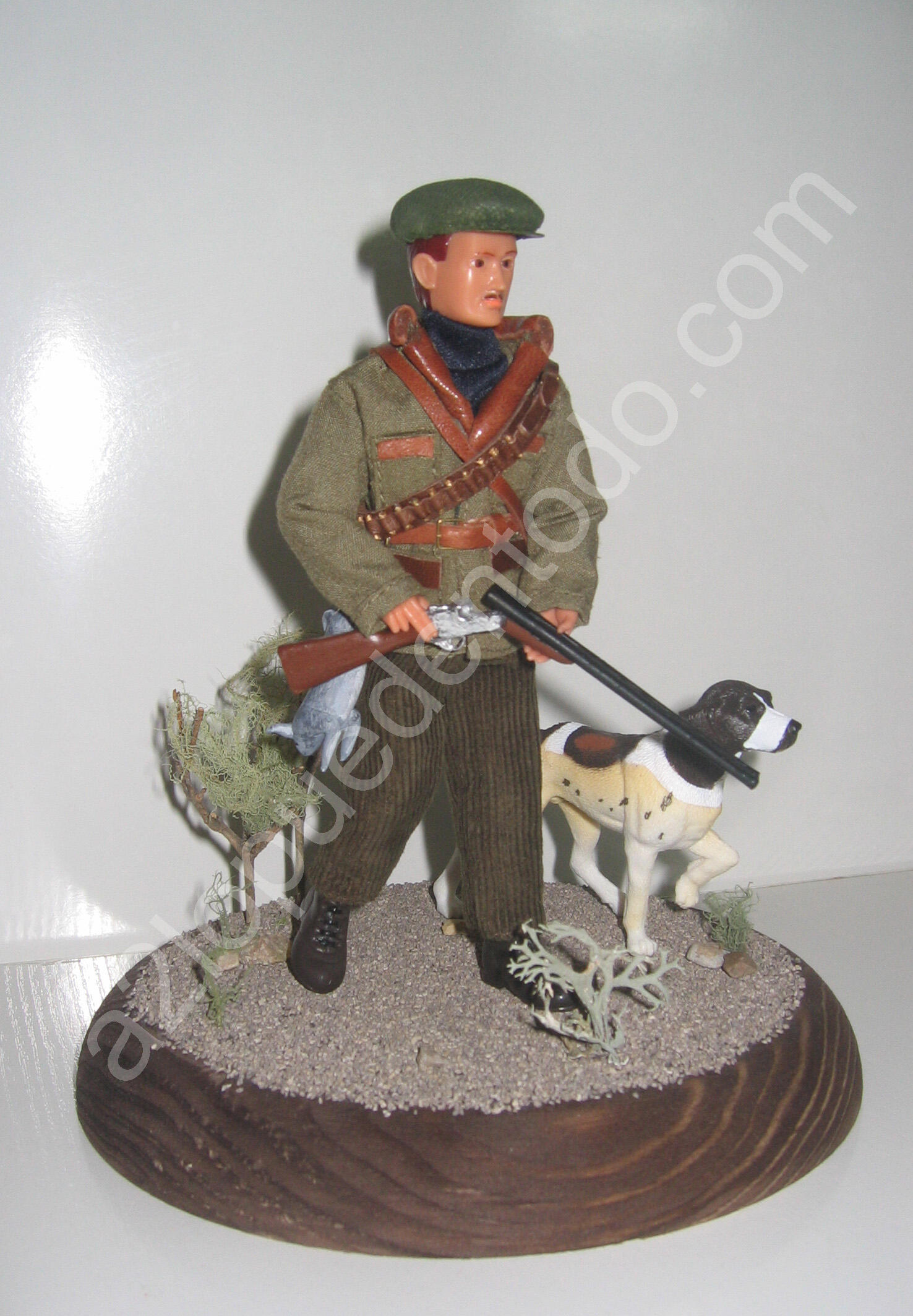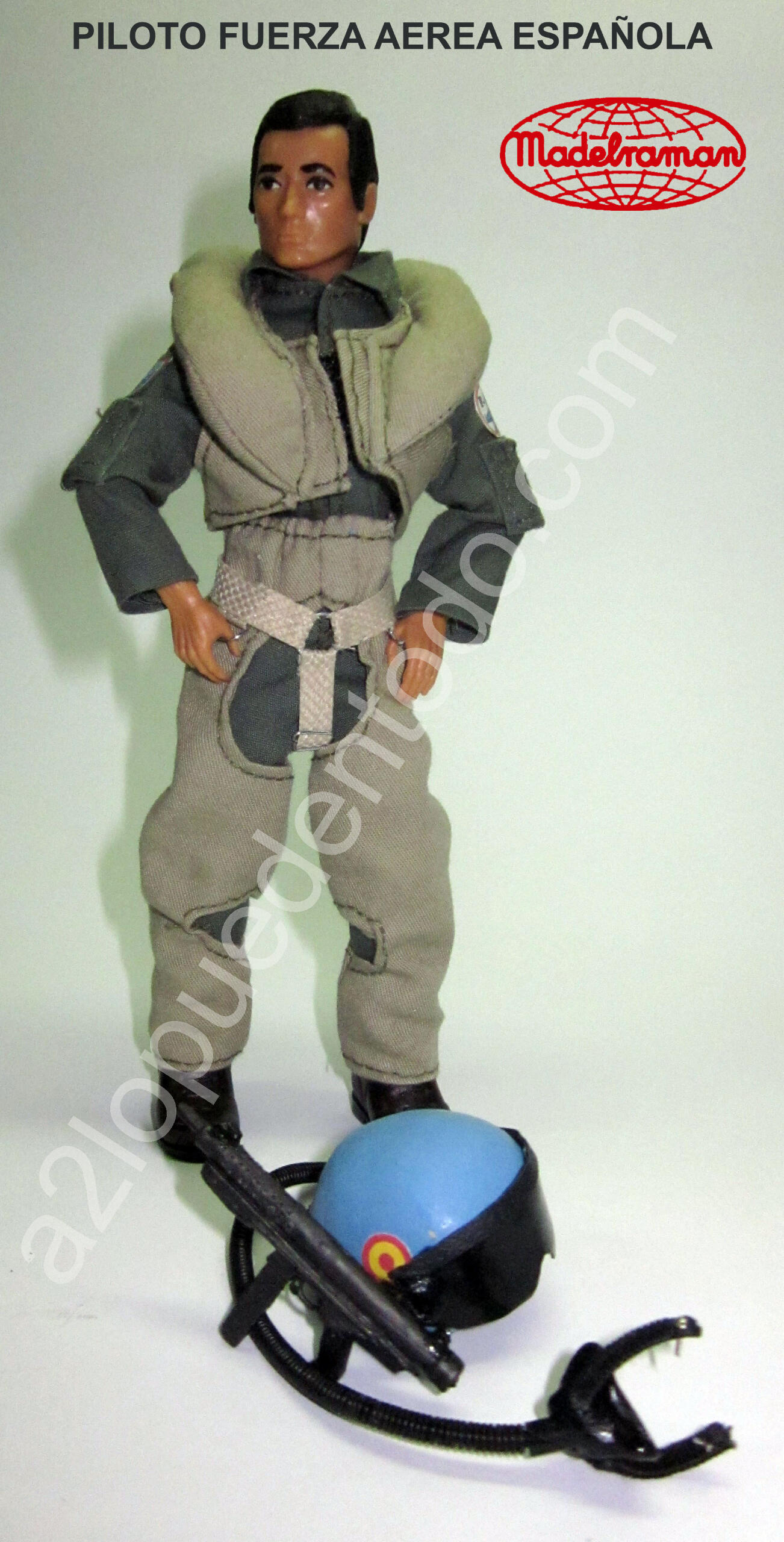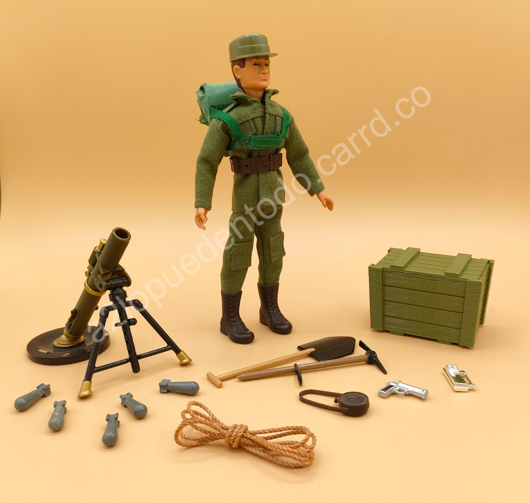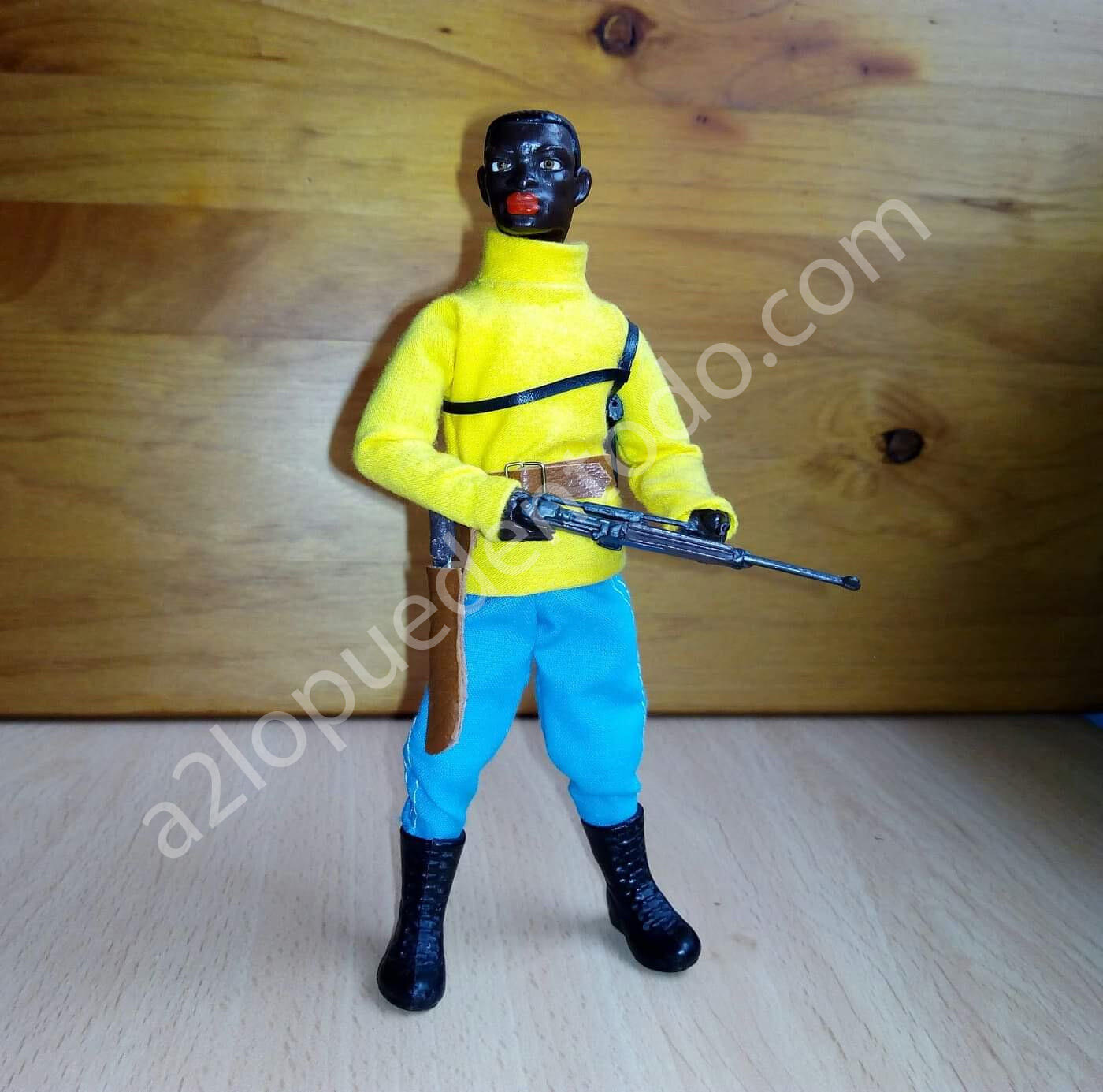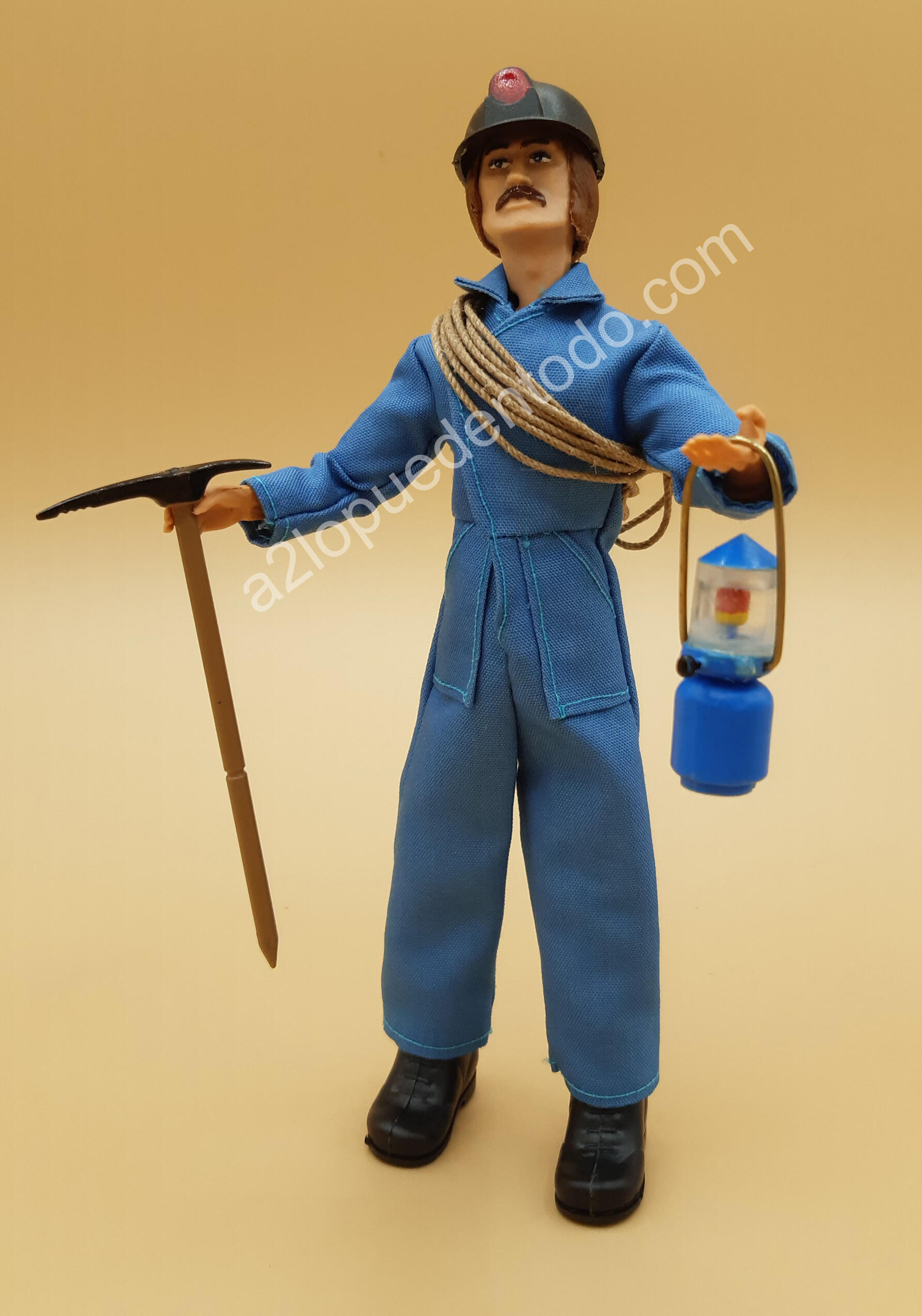 Ropa cosida a medida sobre maniquí reinyectado. Botas, walkie talkie, cetme y prismáticos reinyectados. Gorra y garfio con cuerda Altaya.