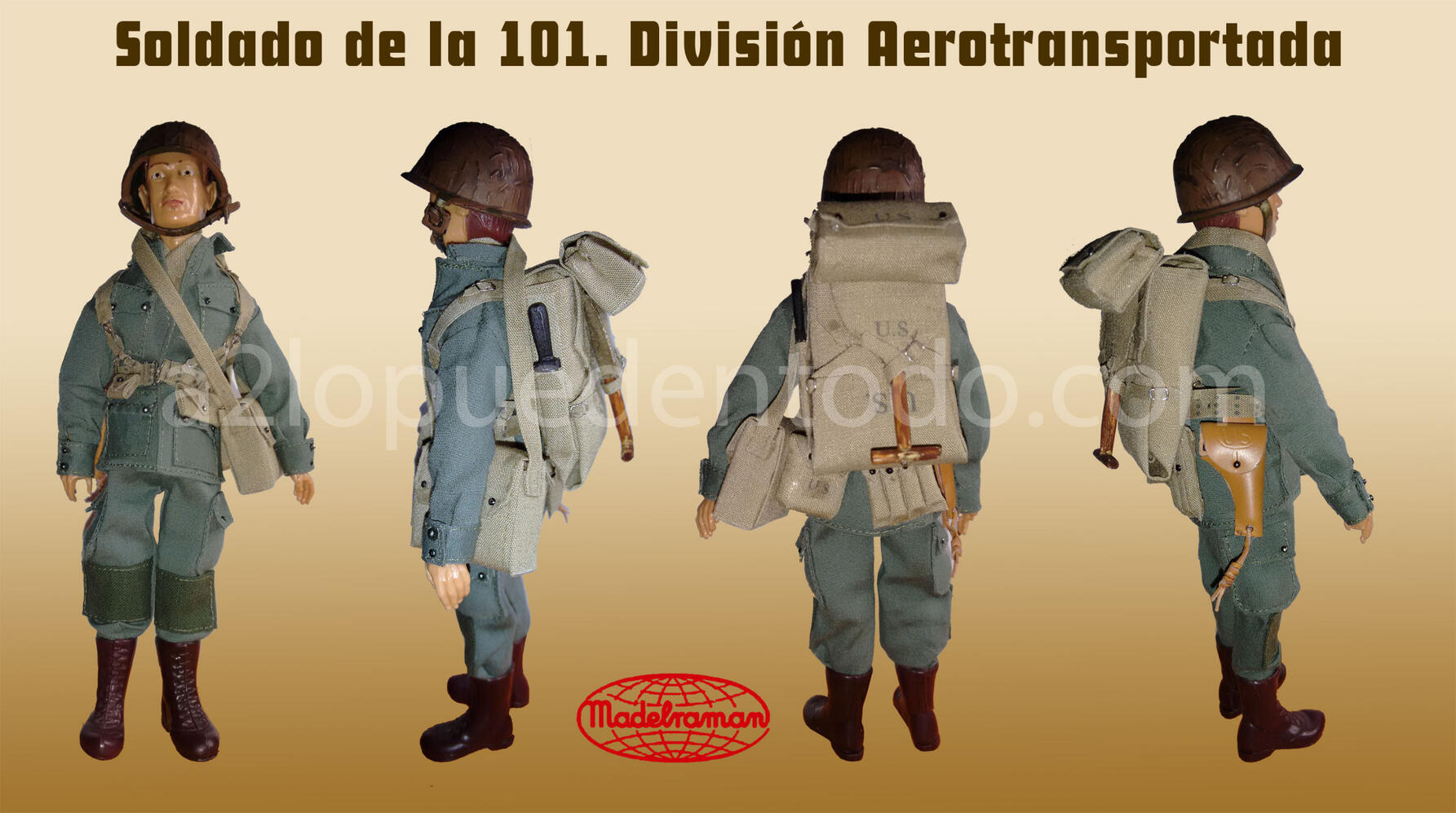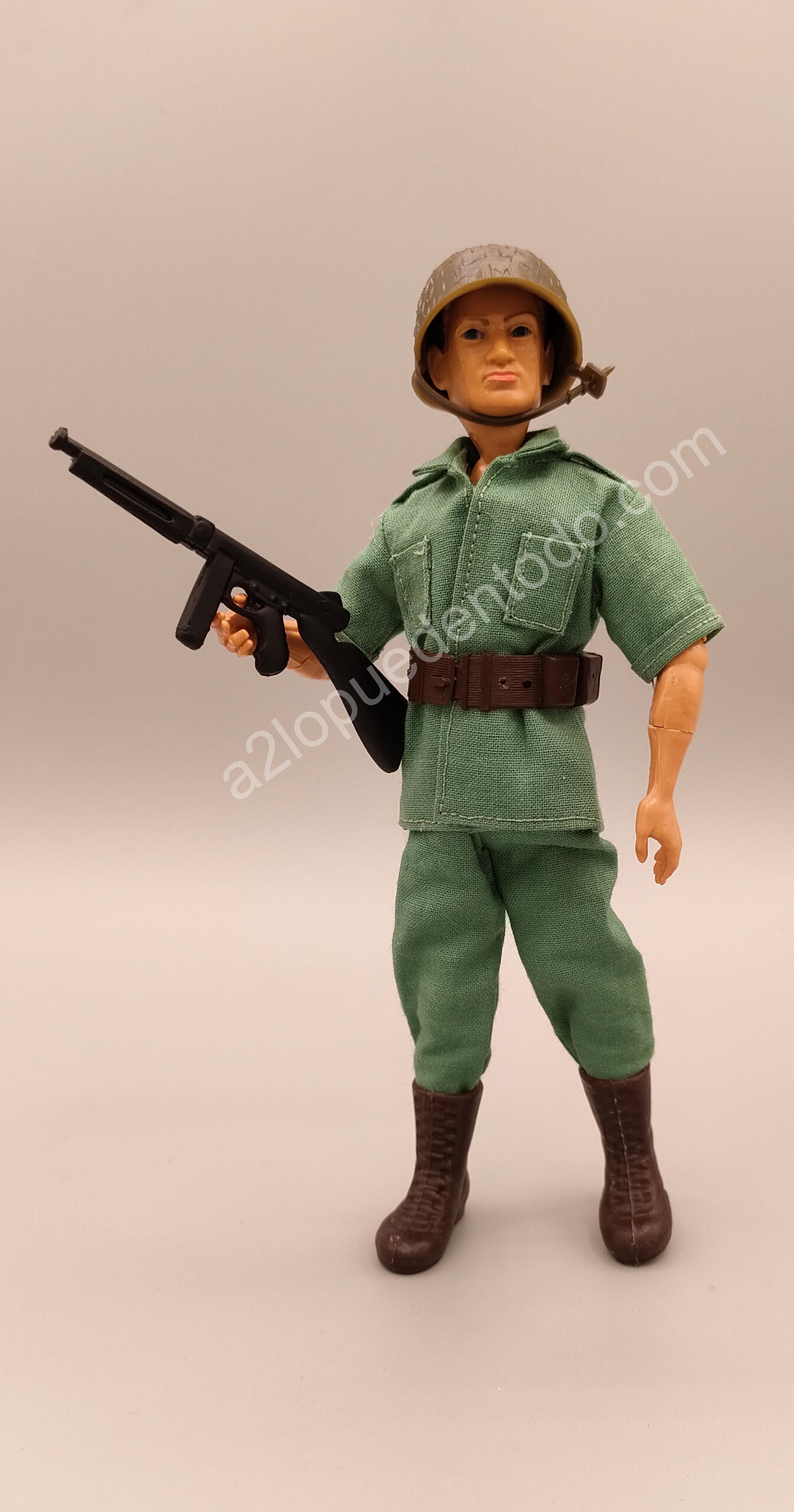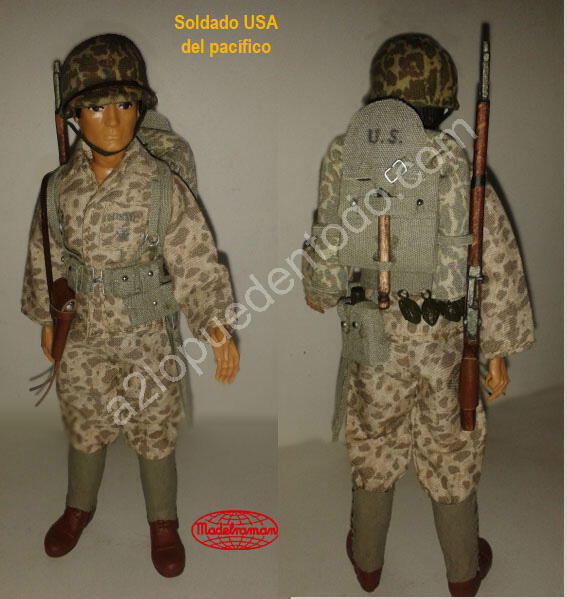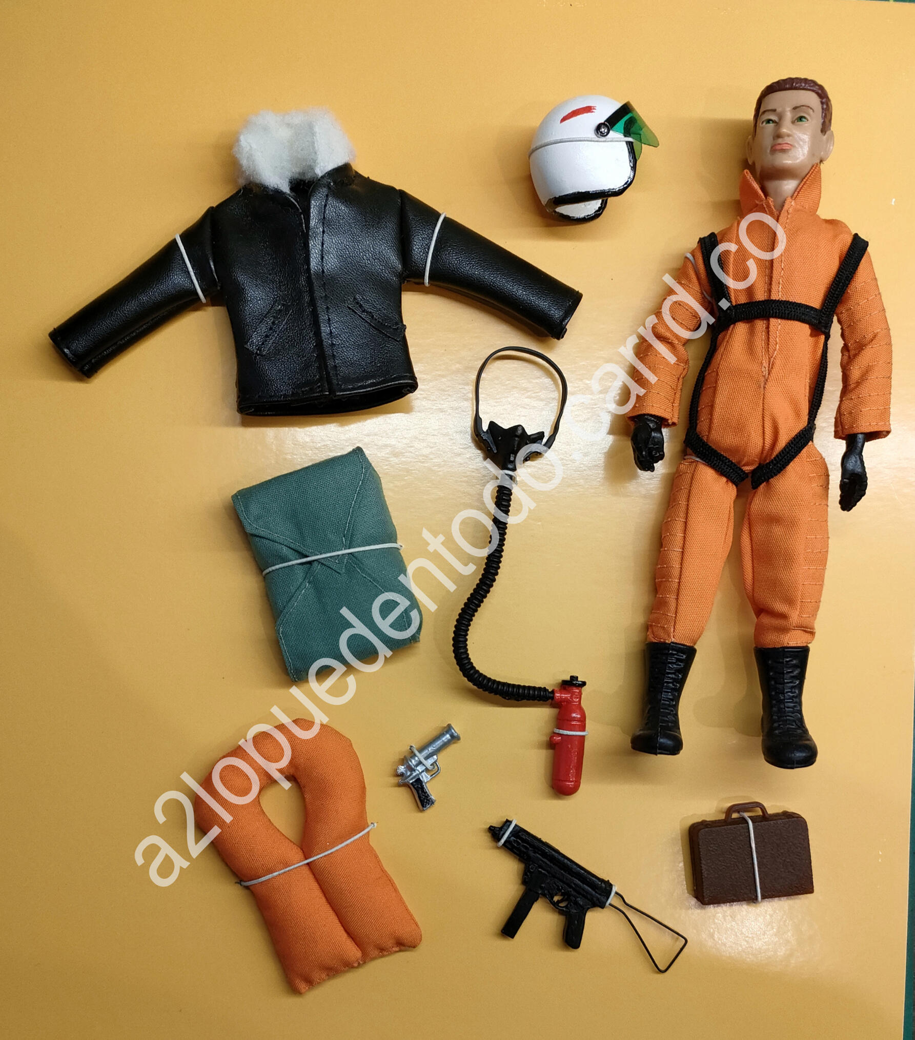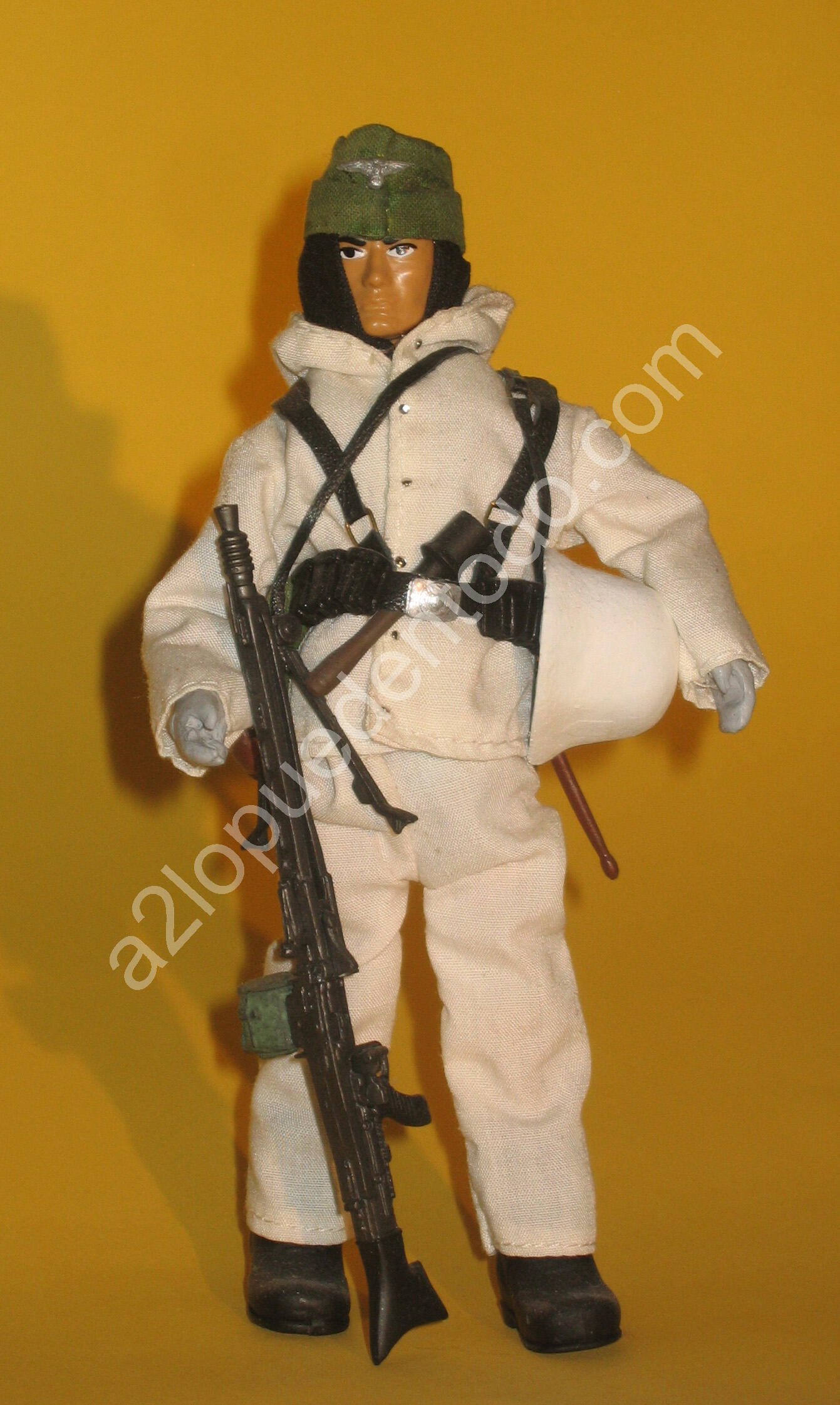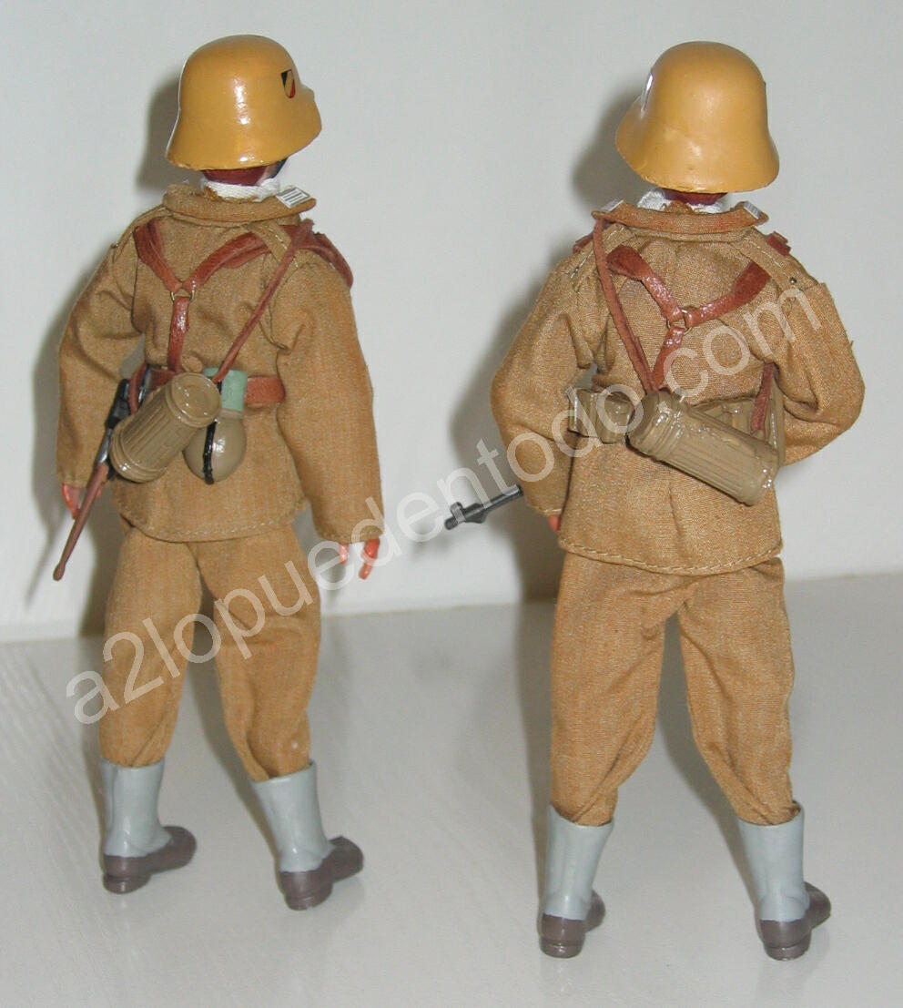 Ropa cosida a medida sobre maniquí reinyectado. Botas, walkie talkie, cetme y prismáticos reinyectados. Gorra y garfio con cuerda Altaya.
