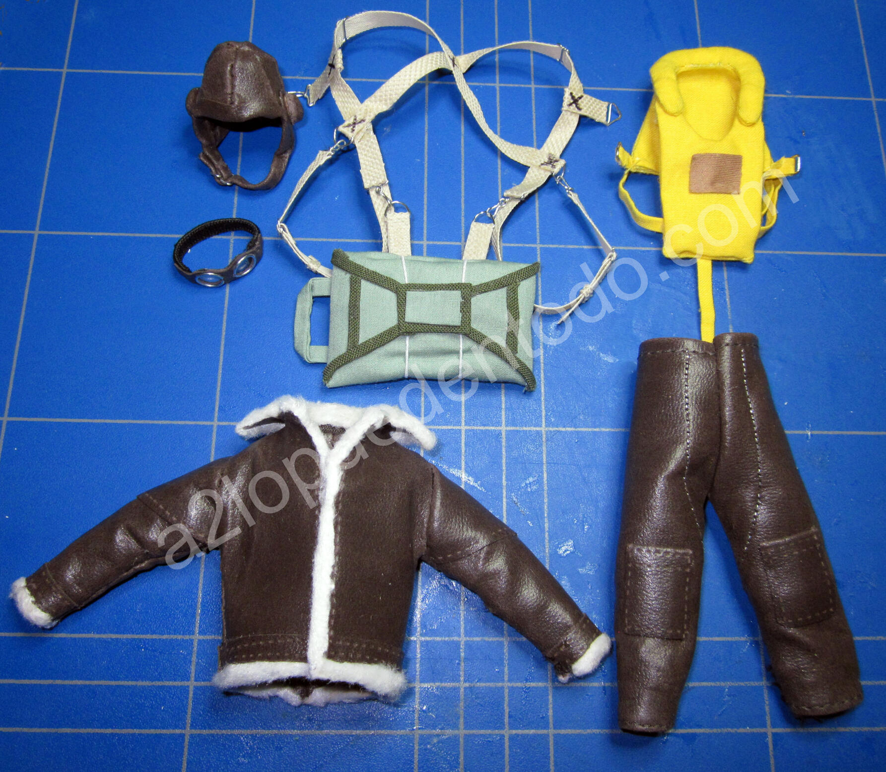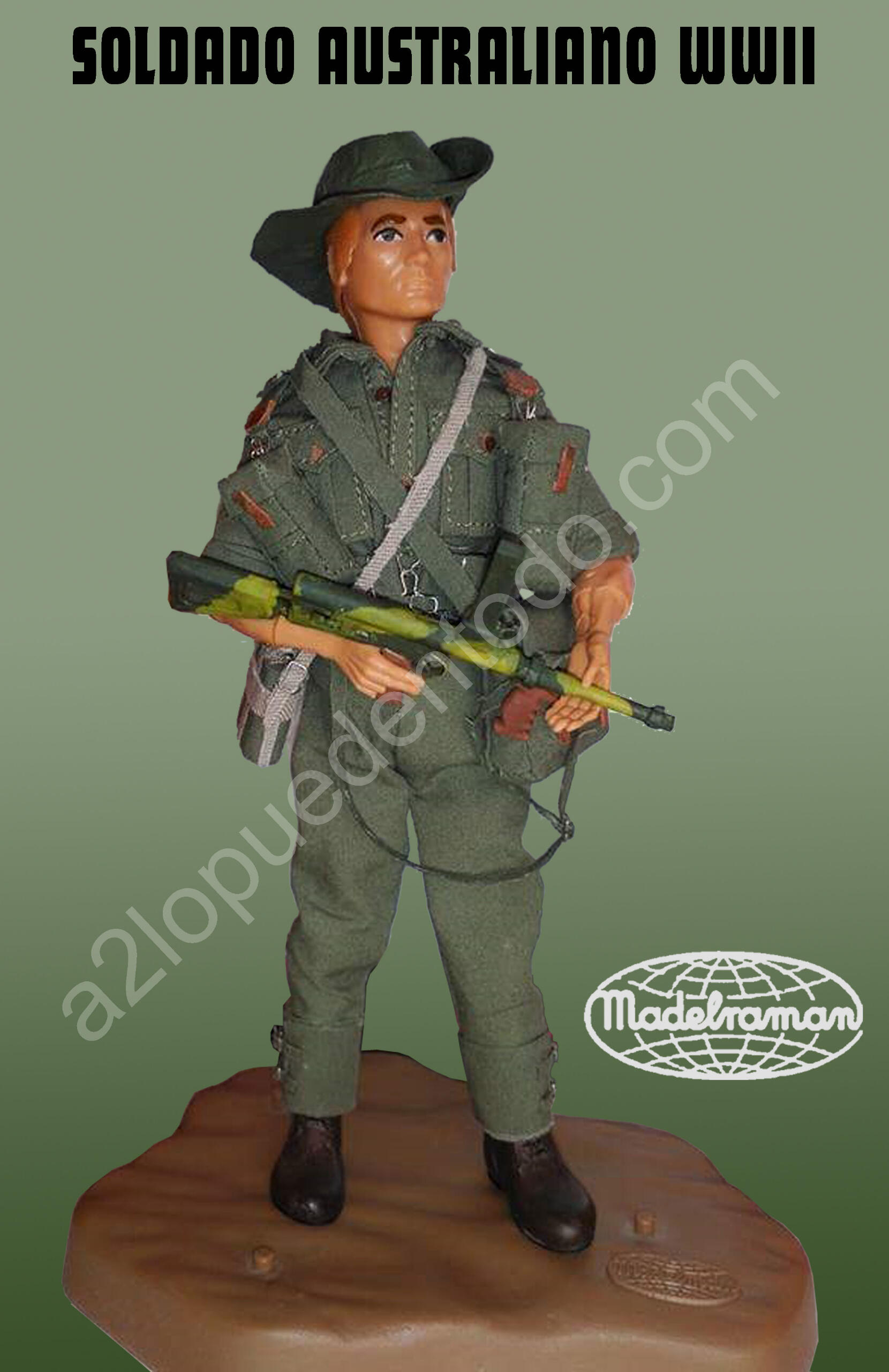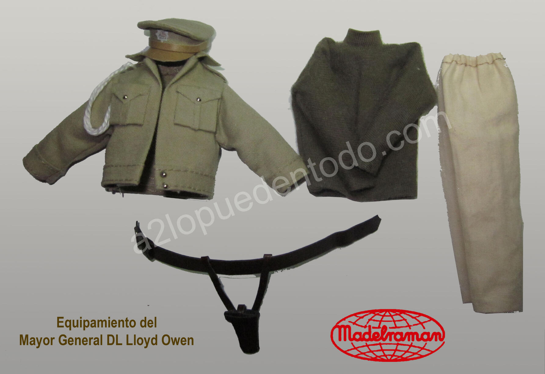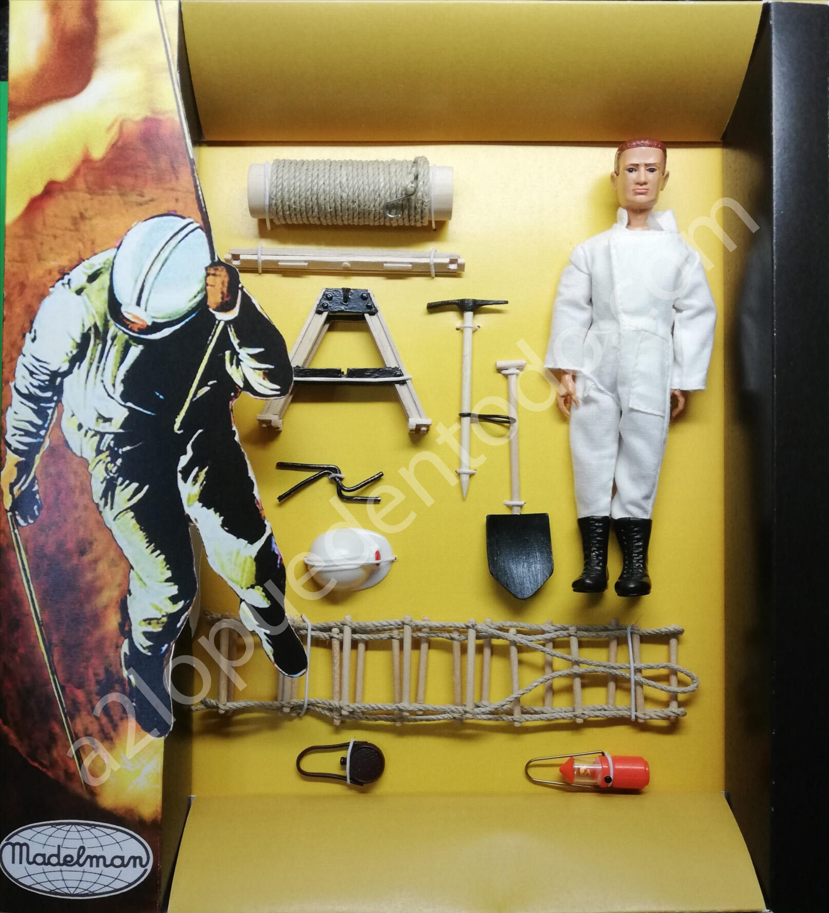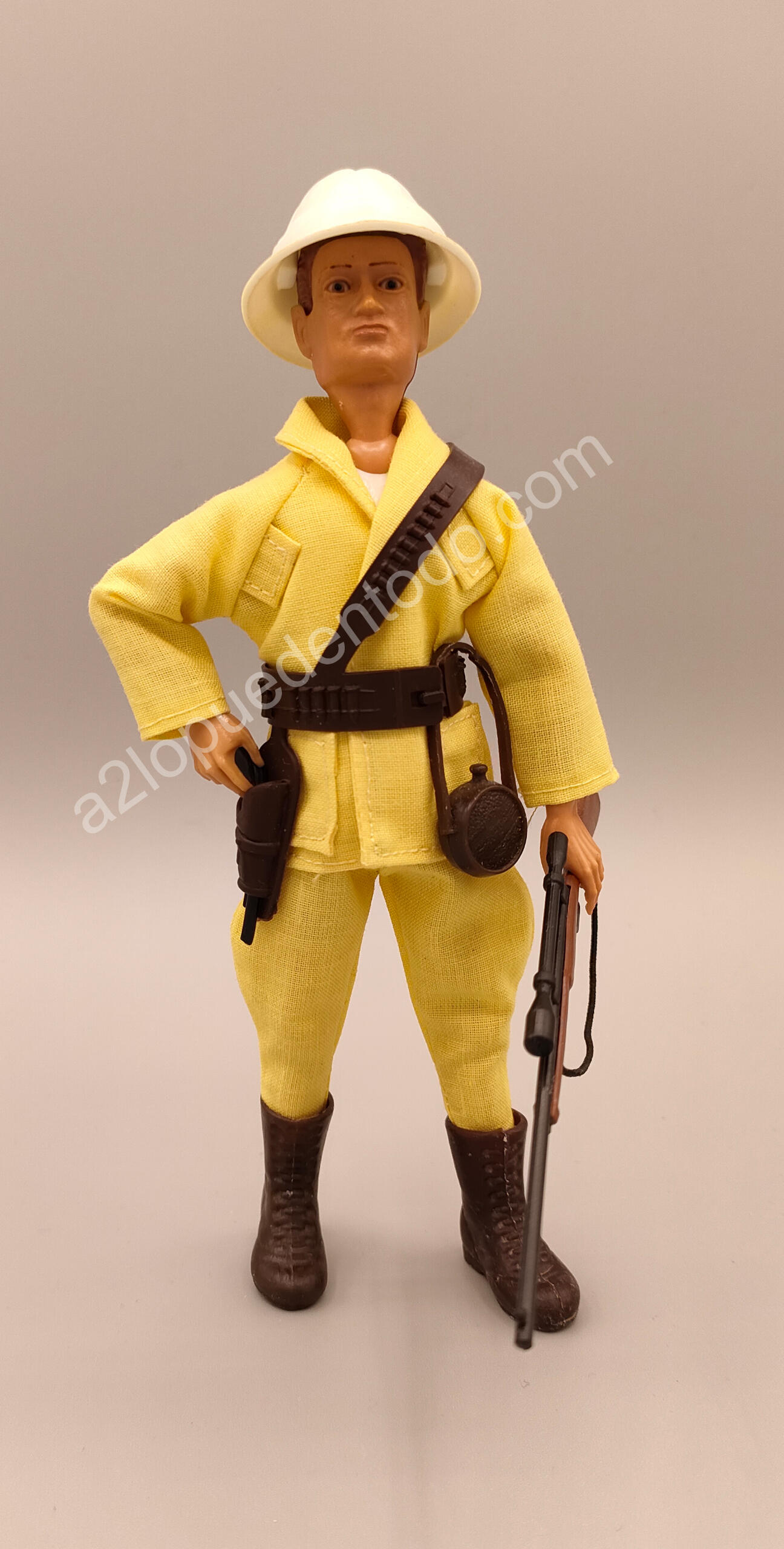 Ropa cosida a medida sobre maniquí reinyectado. Botas, walkie talkie, cetme y prismáticos reinyectados. Gorra y garfio con cuerda Altaya.
