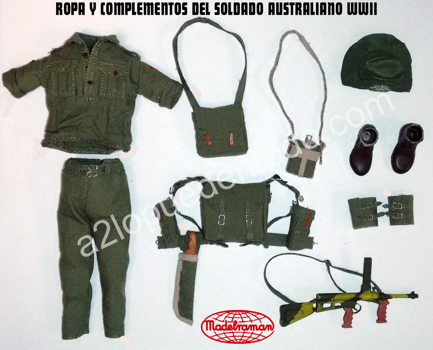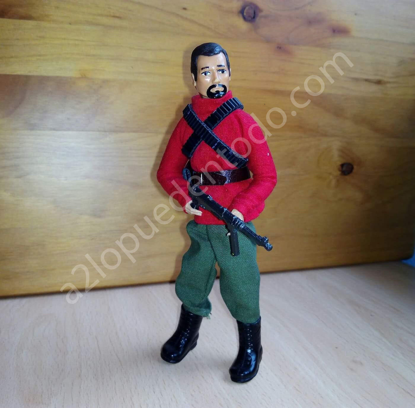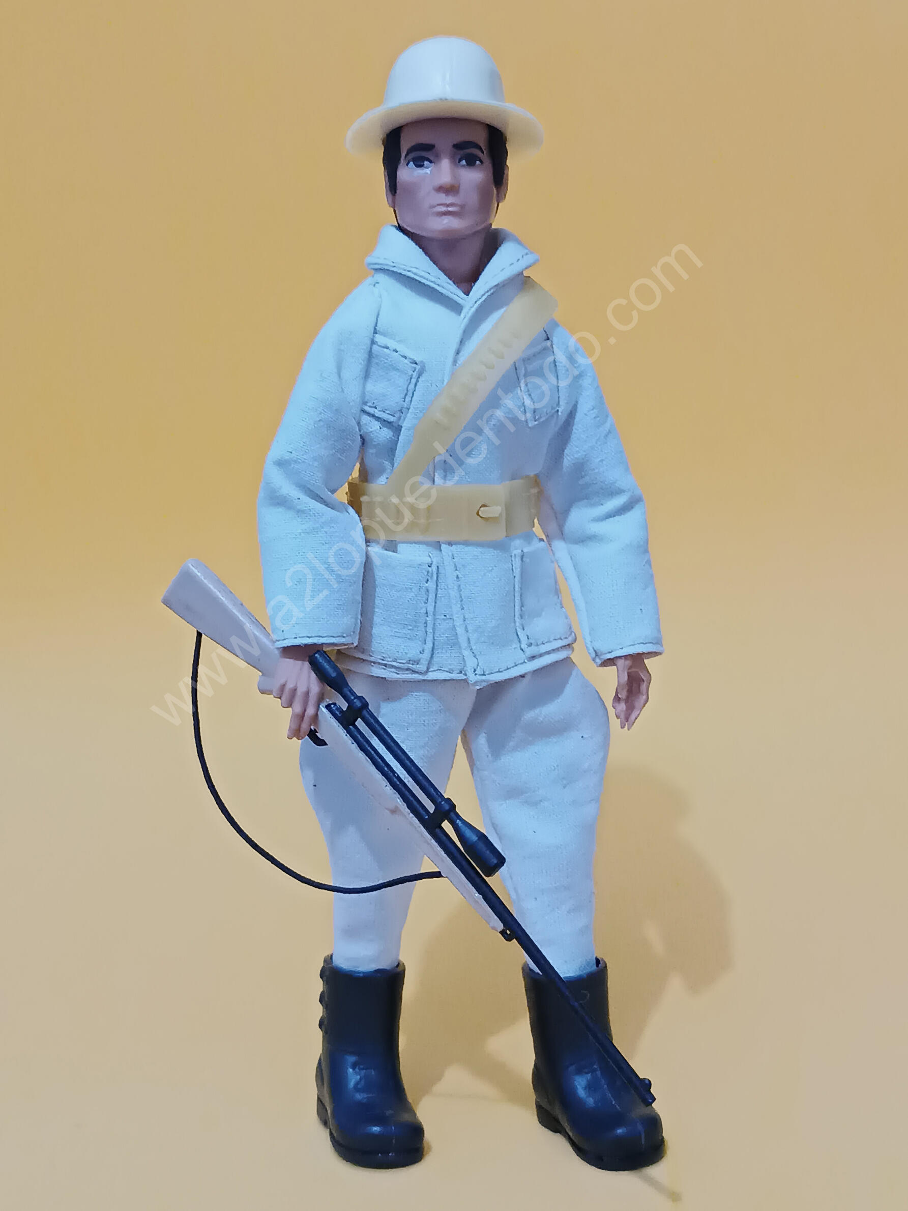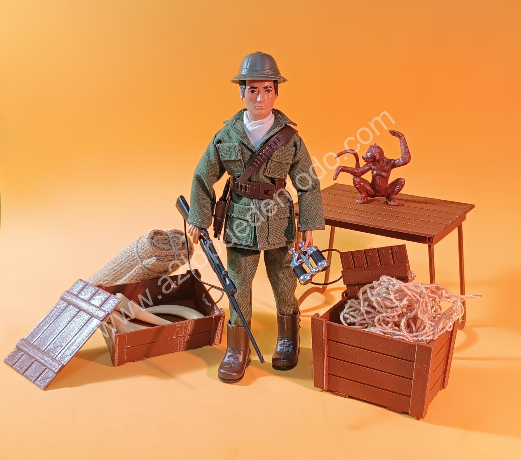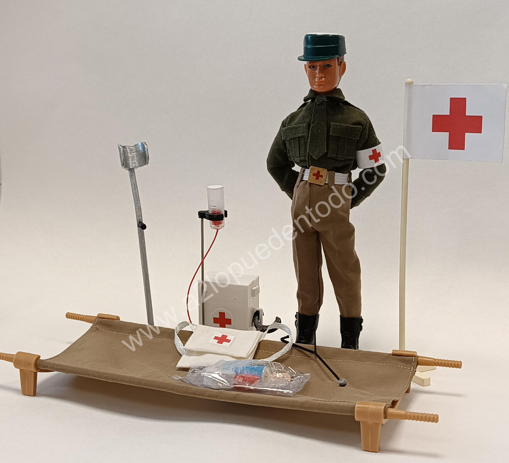 Ropa cosida a medida sobre maniquí reinyectado. Botas, walkie talkie, cetme y prismáticos reinyectados. Gorra y garfio con cuerda Altaya.