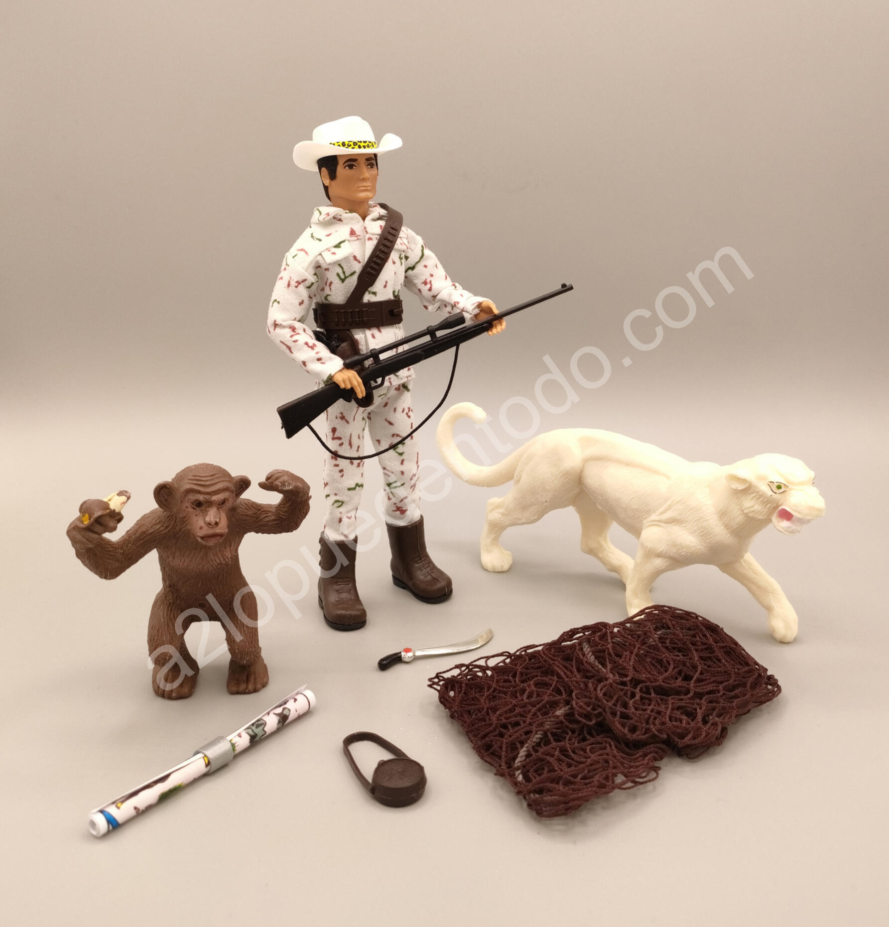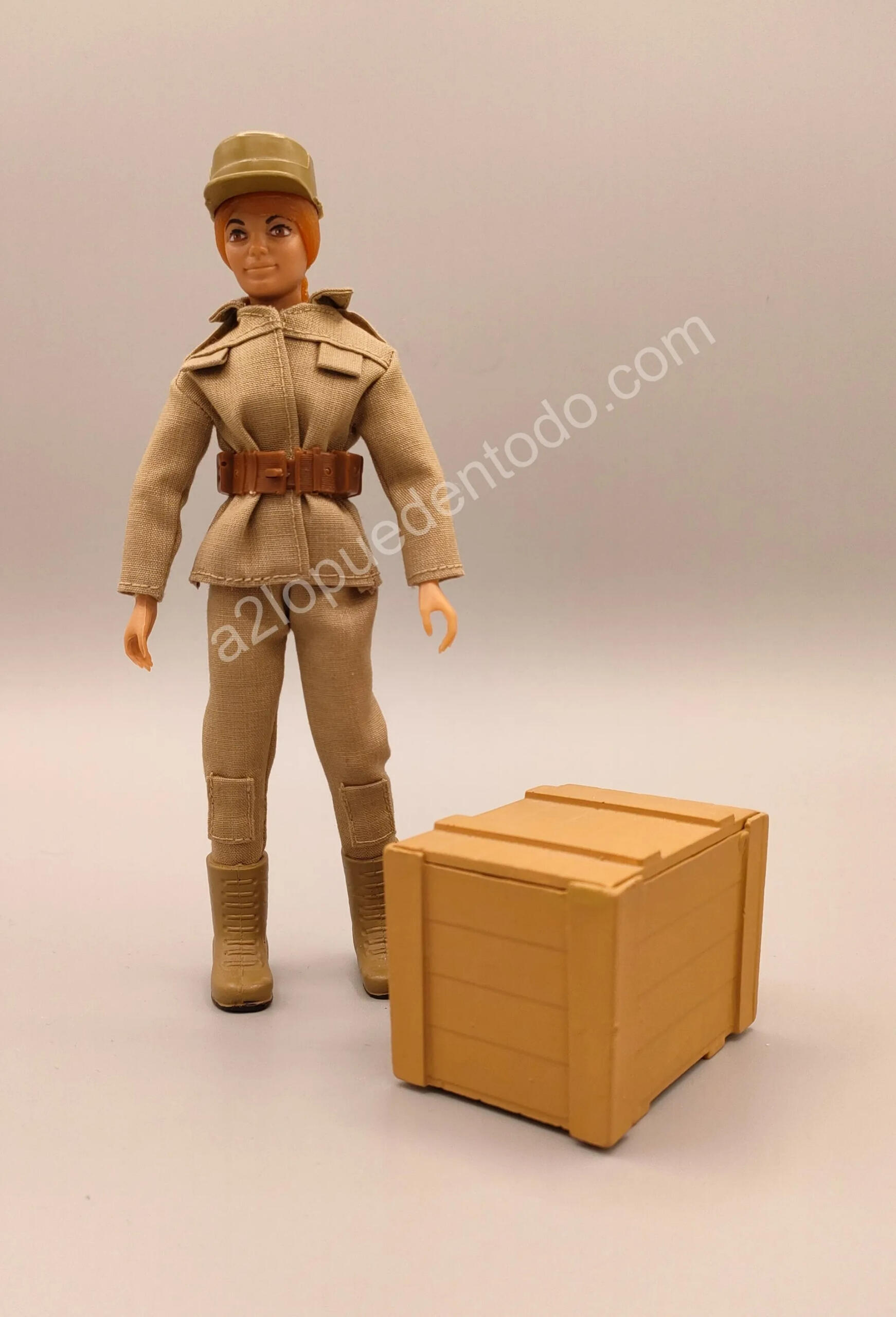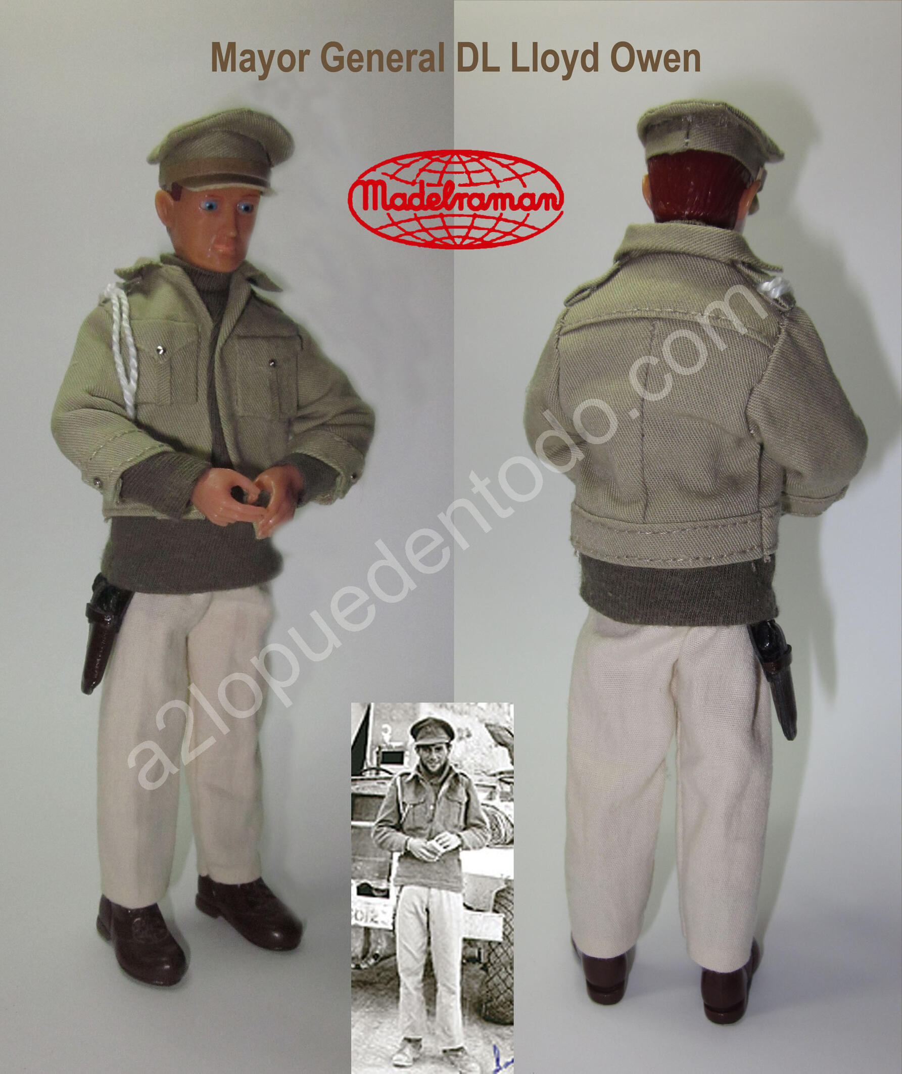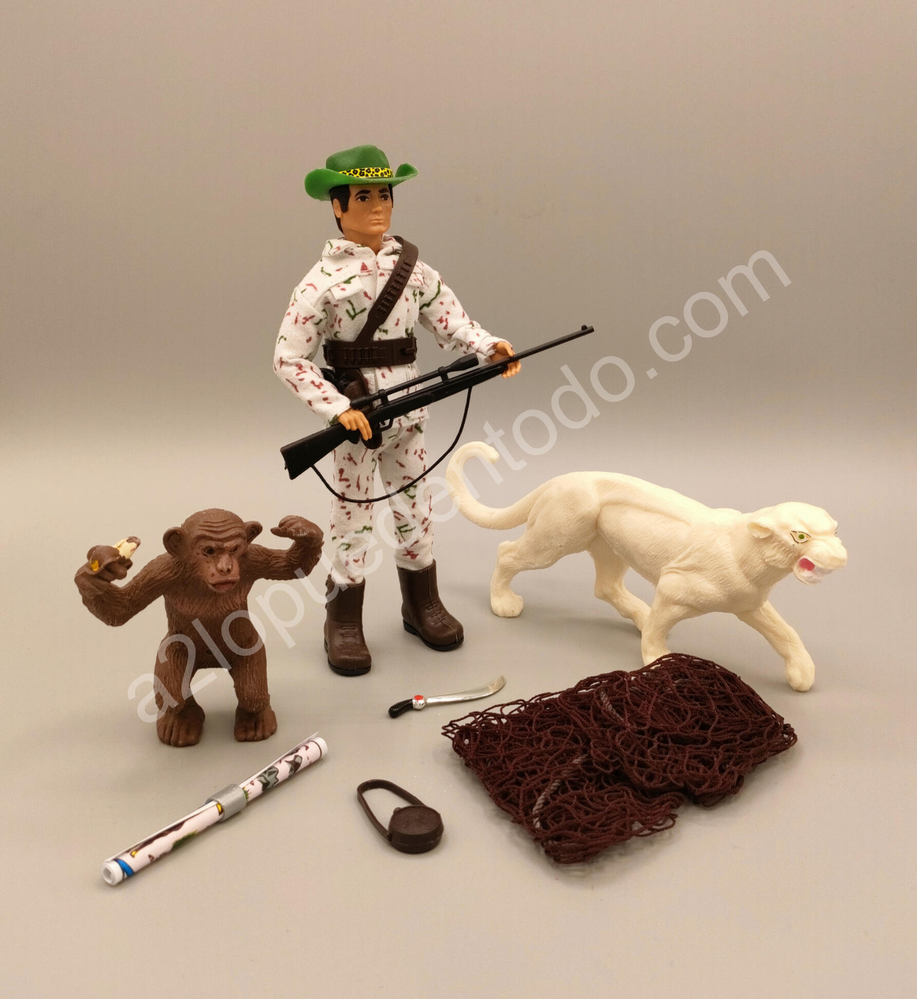 Ropa cosida a medida sobre maniquí reinyectado. Botas, walkie talkie, cetme y prismáticos reinyectados. Gorra y garfio con cuerda Altaya.