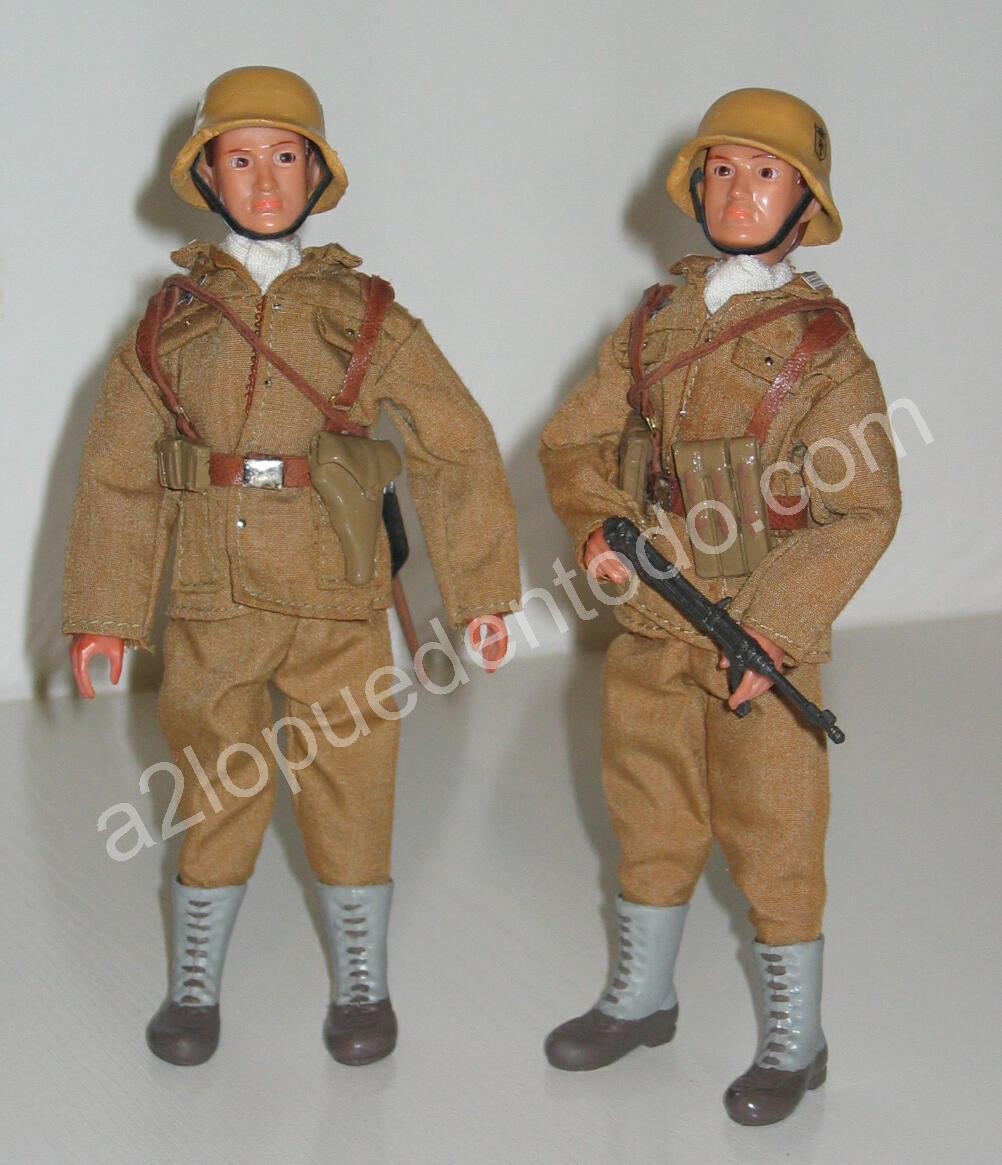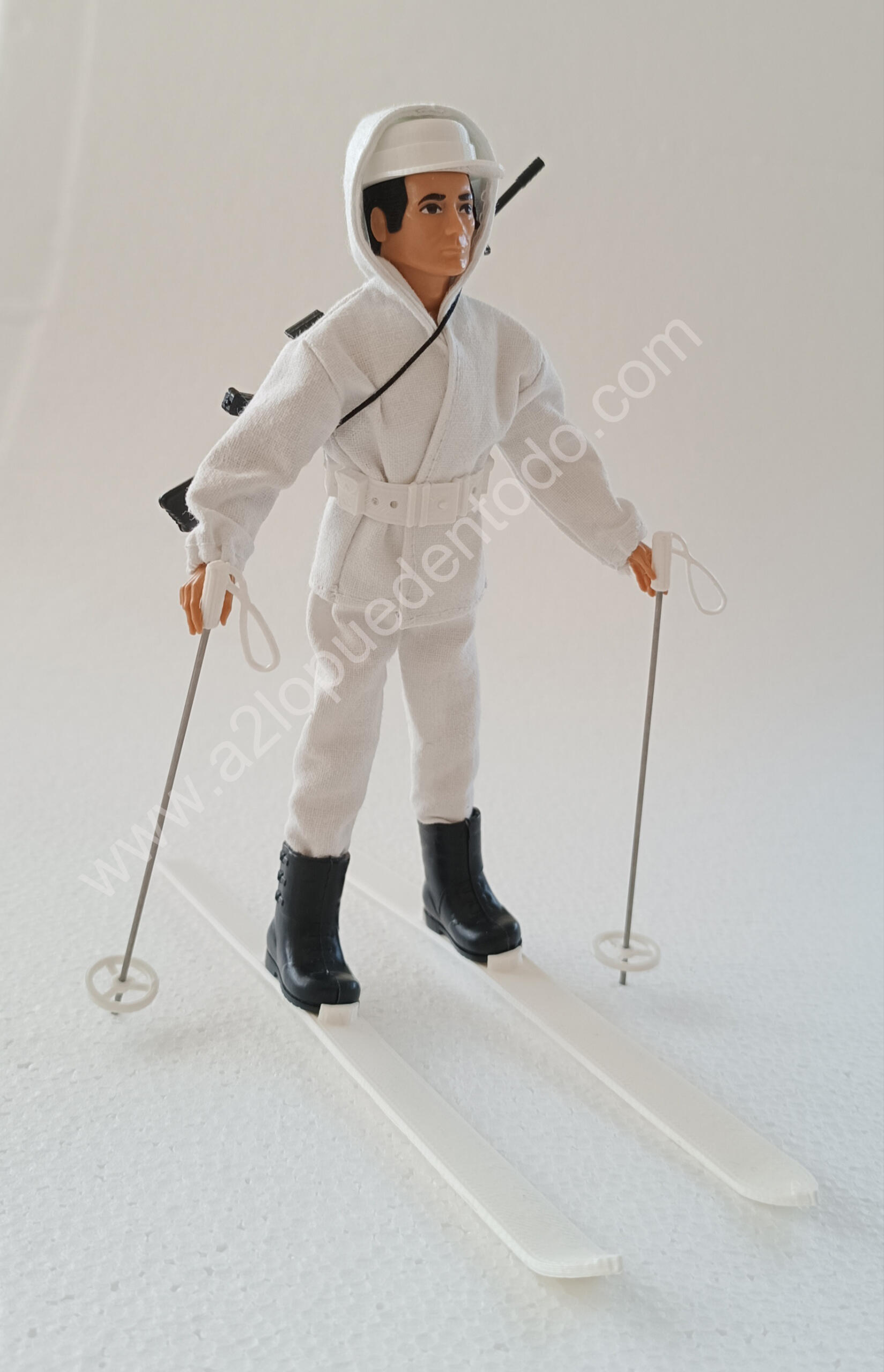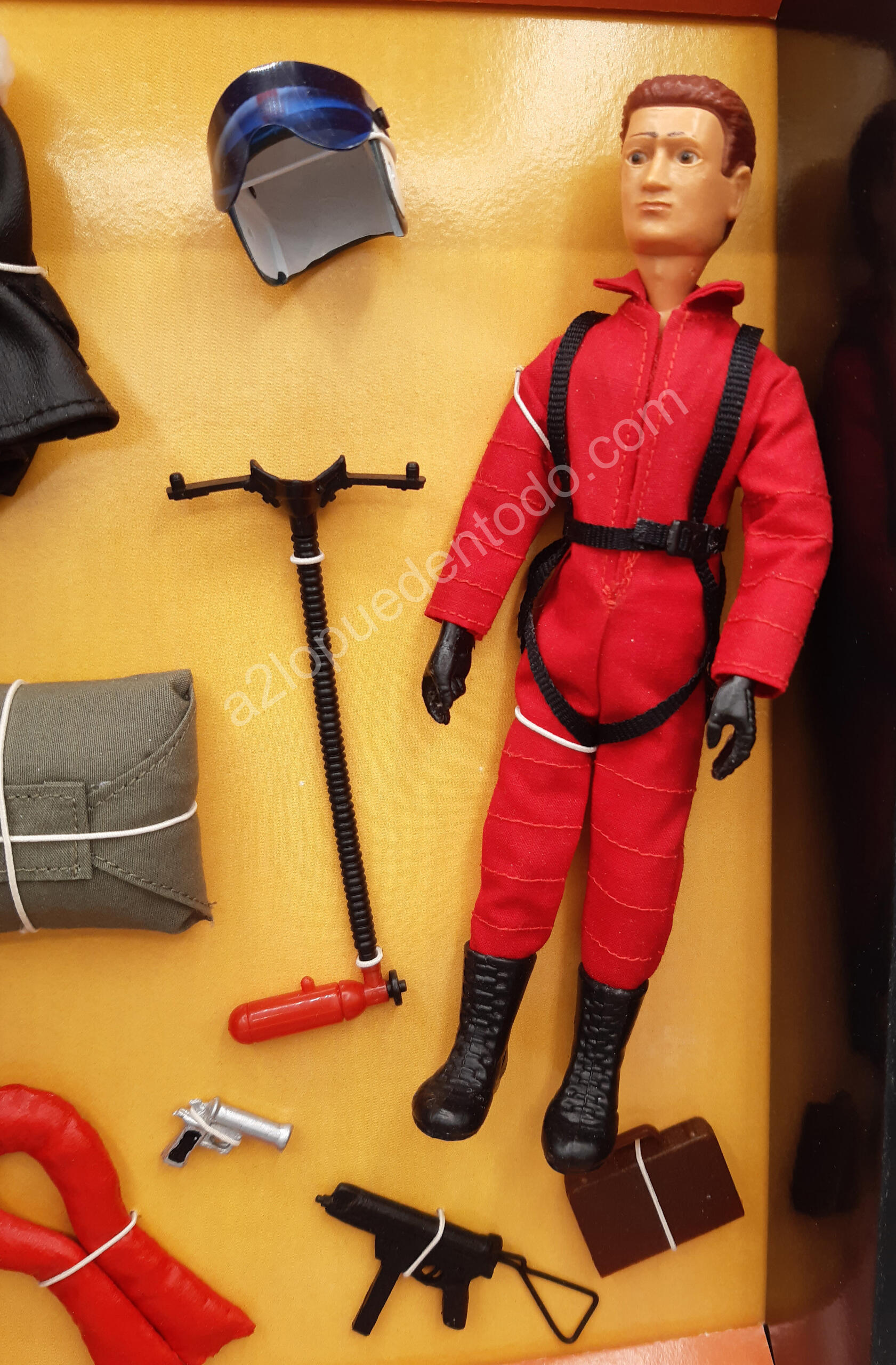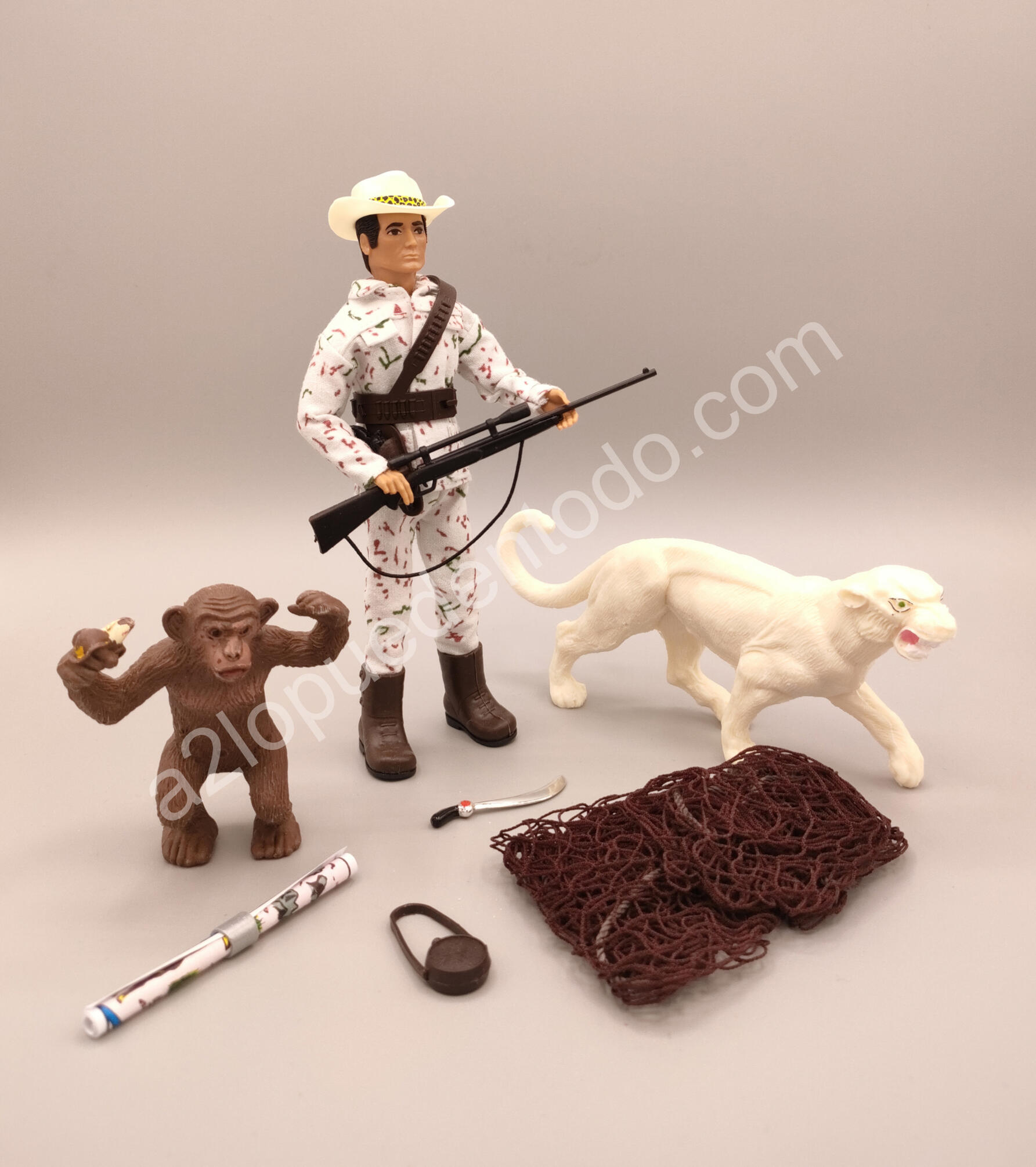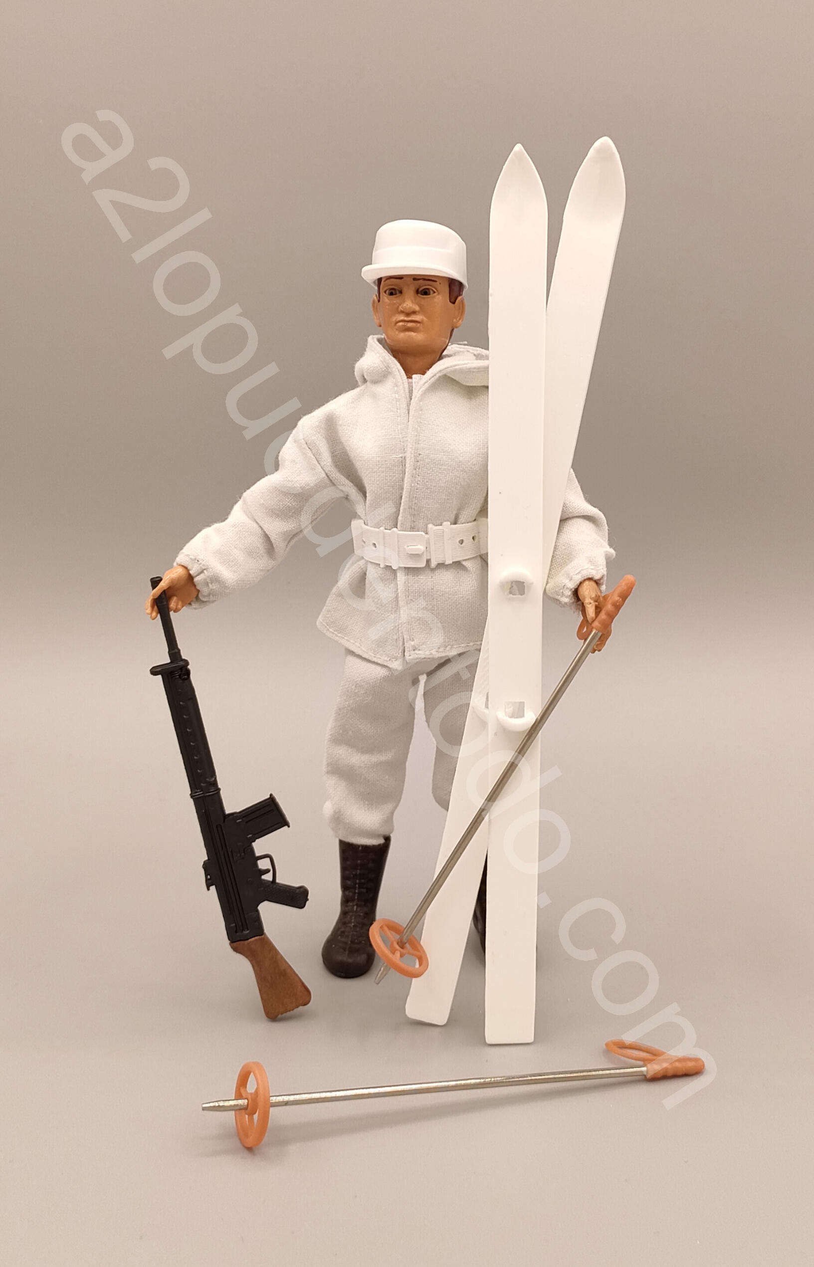 Ropa cosida a medida sobre maniquí reinyectado. Botas, walkie talkie, cetme y prismáticos reinyectados. Gorra y garfio con cuerda Altaya.