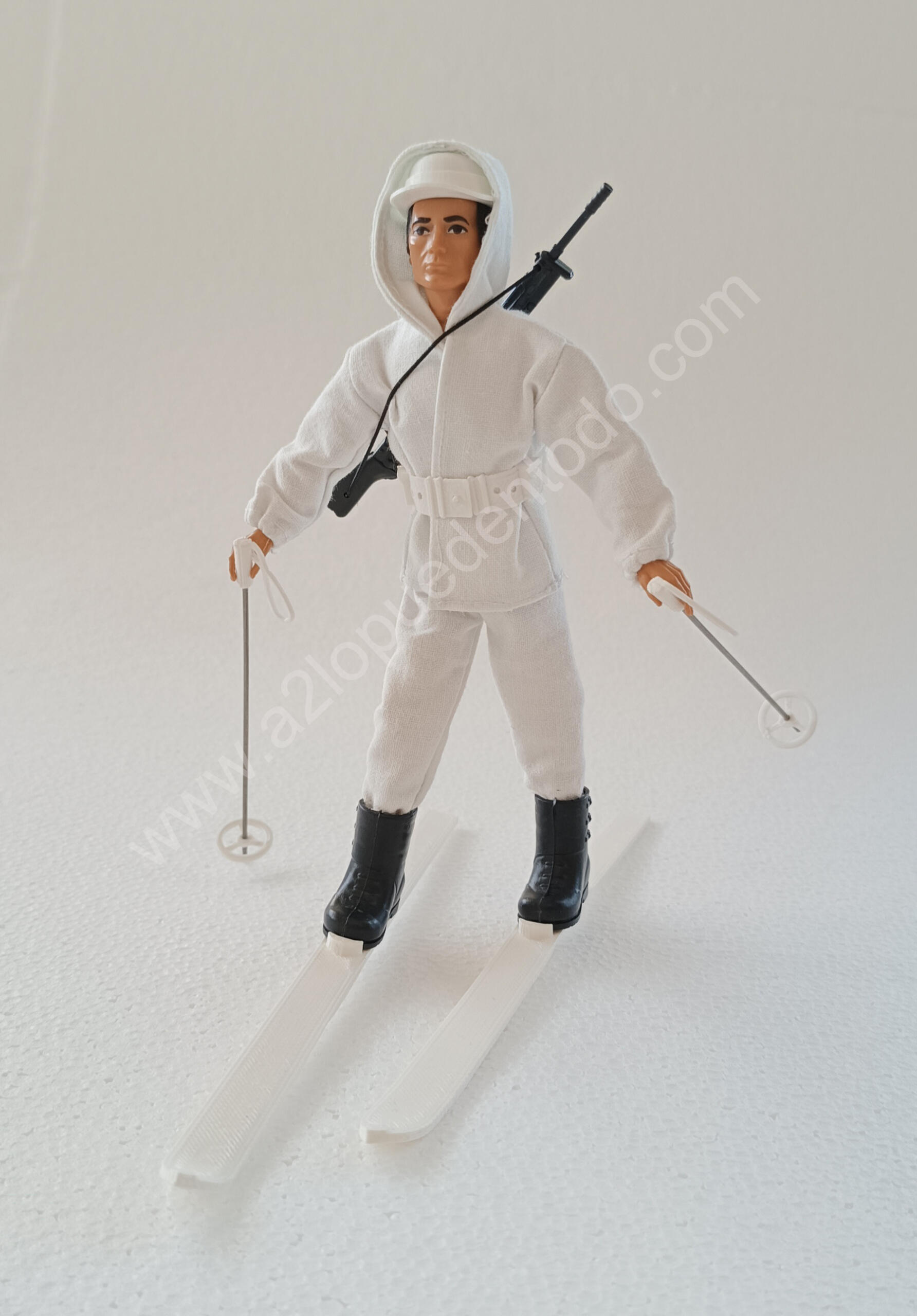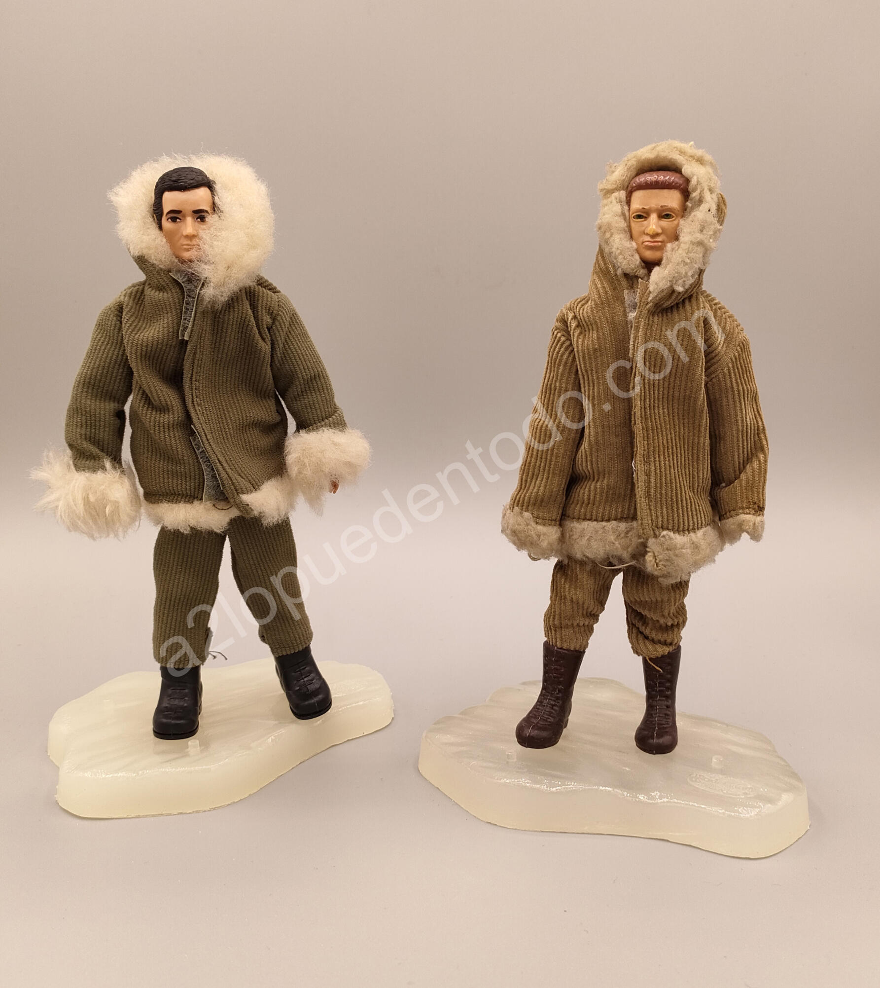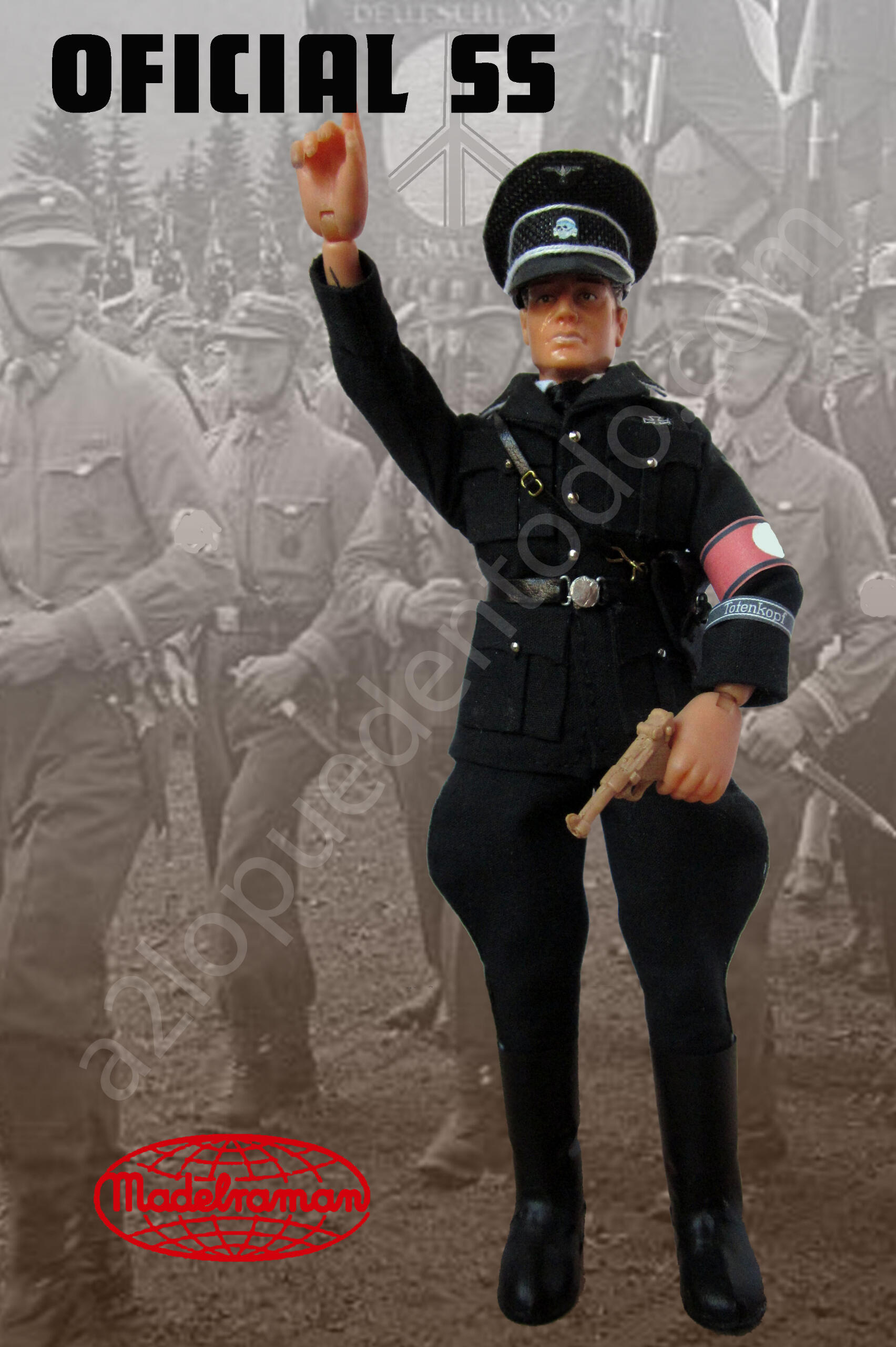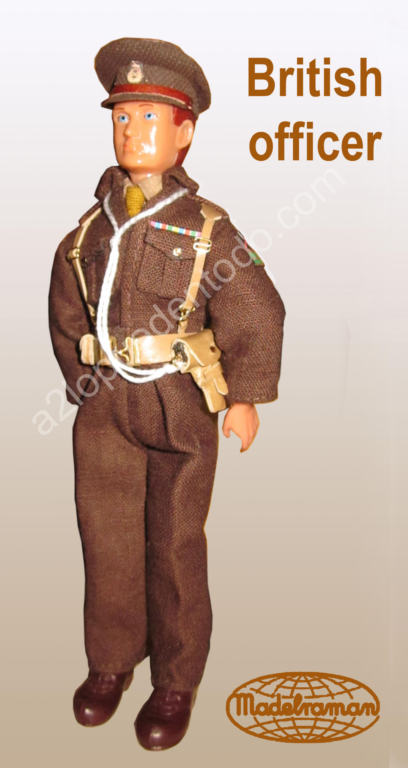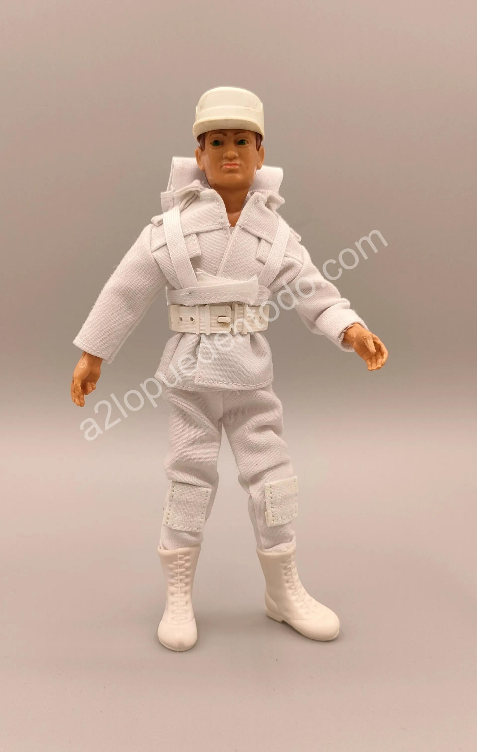 Ropa cosida a medida sobre maniquí reinyectado. Botas, walkie talkie, cetme y prismáticos reinyectados. Gorra y garfio con cuerda Altaya.