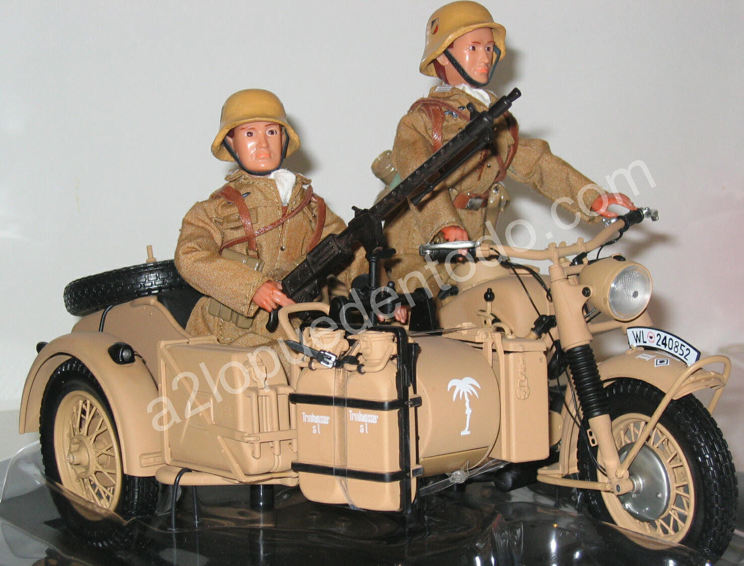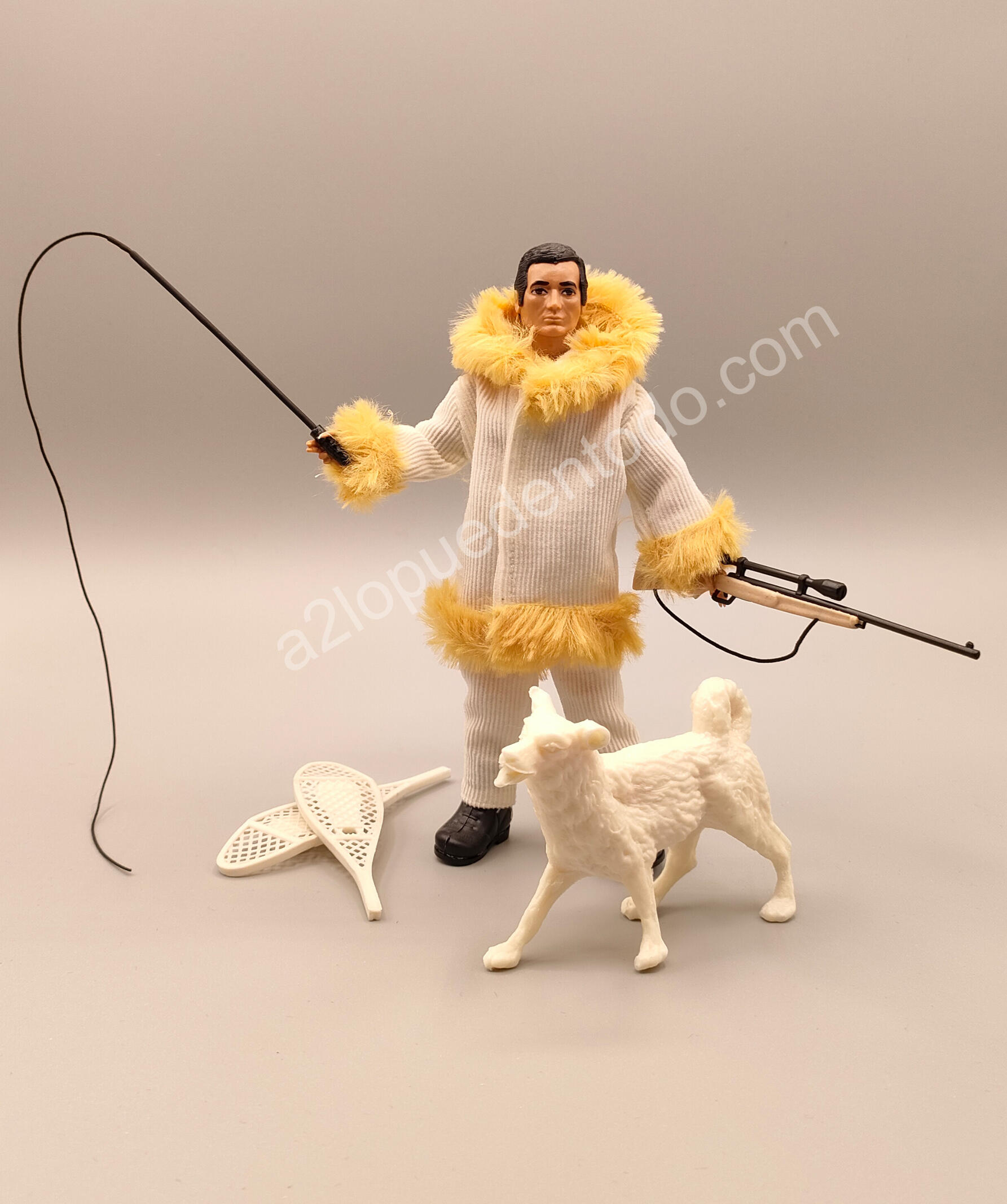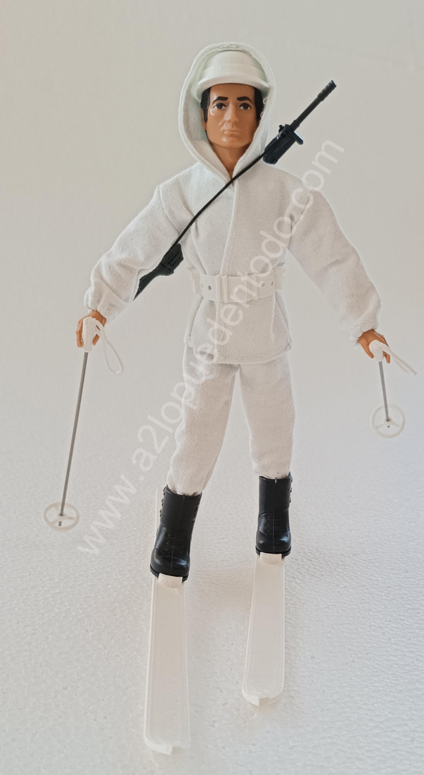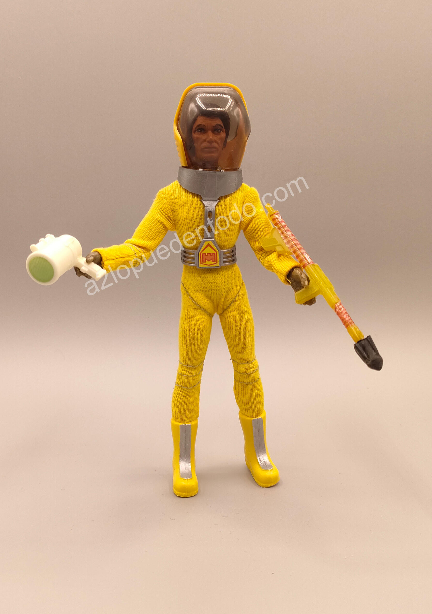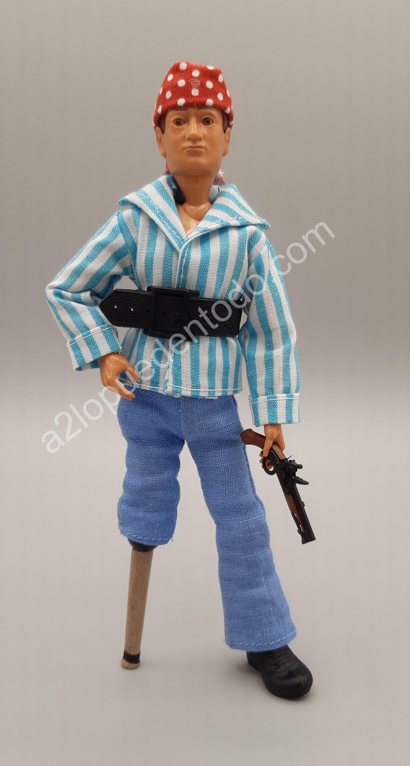 Ropa cosida a medida sobre maniquí reinyectado. Botas, walkie talkie, cetme y prismáticos reinyectados. Gorra y garfio con cuerda Altaya.