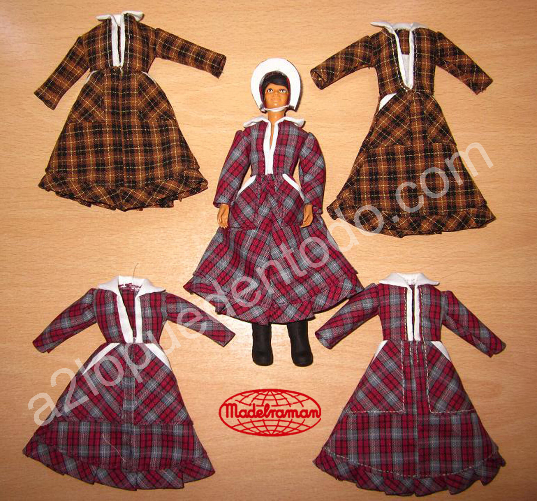 Ropa cosida a medida sobre maniquí reinyectado. Mocasines y collar realizados artesanalmente. Pluma reinyectada. Este modelo de vestido forma parte de una serie de siete que realice con la tela que me facilitó un aficionado valenciano, al cual le envié seis unidades, que así mismo, distribuyó entre varios aficionados.