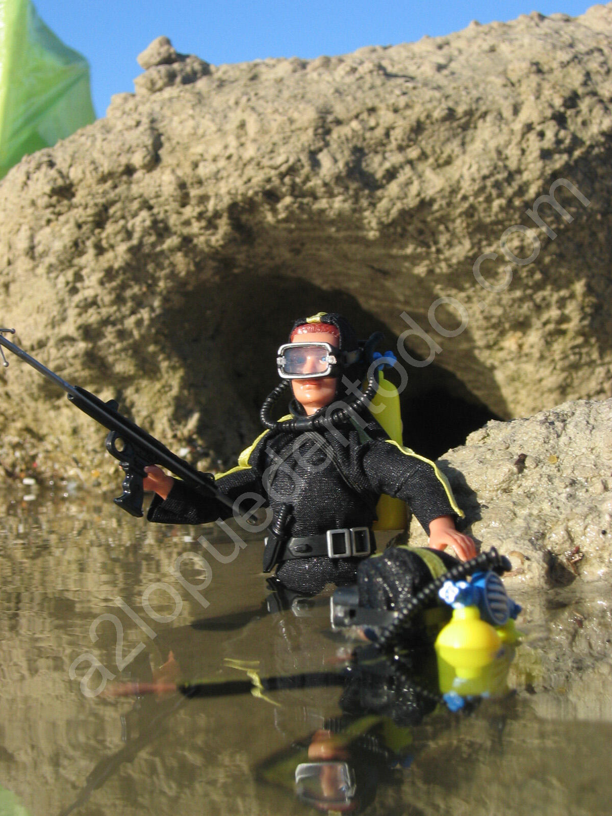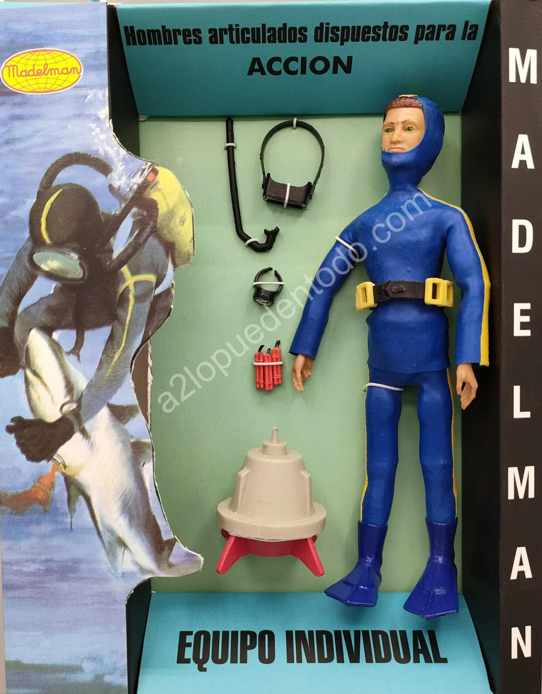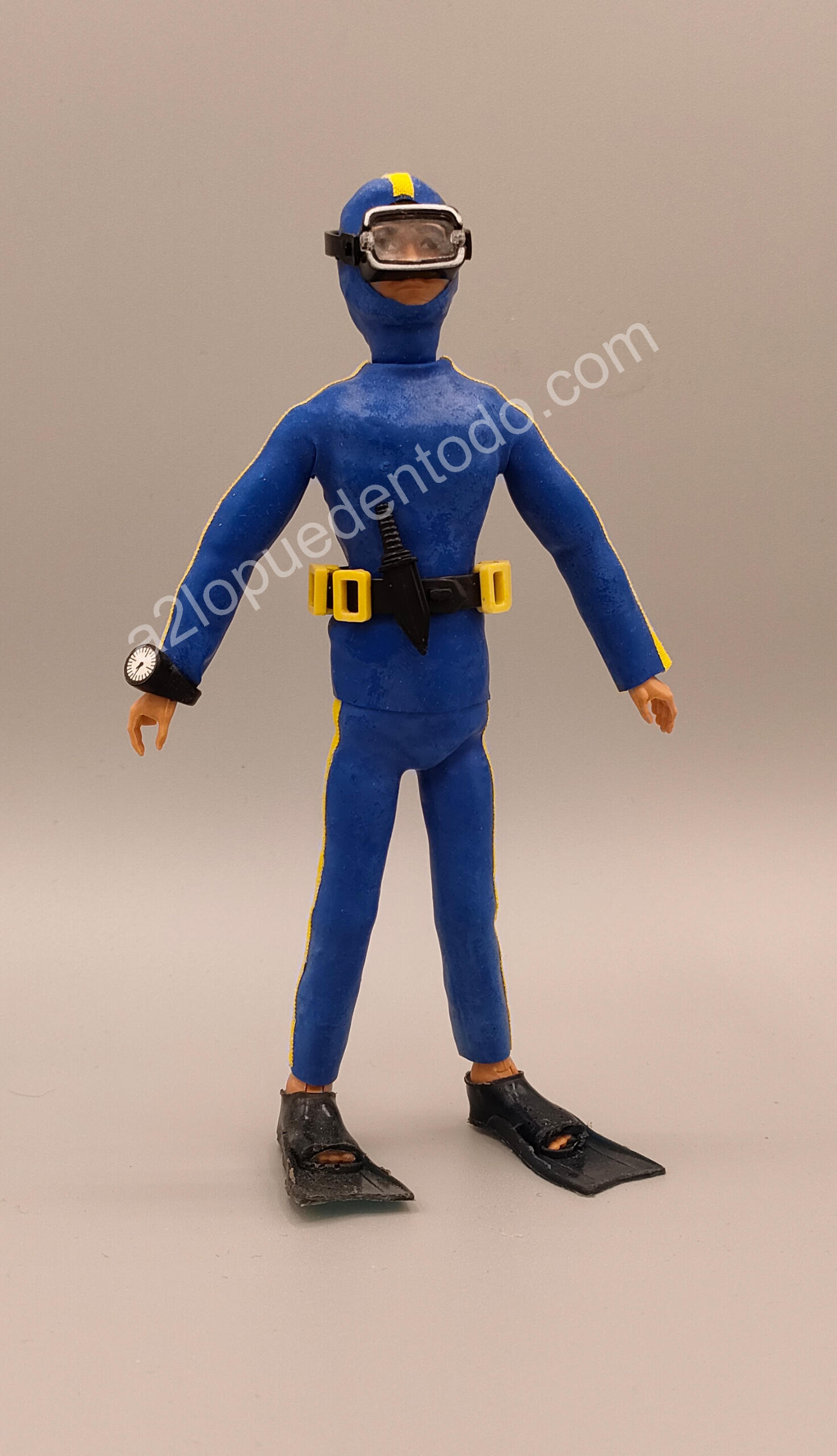 Traje cosido a medida sobre maniquí Altaya con cabeza reinyectada. Complementos altaya. Boya, pesas y bomba diseñadas y realizadas con impresora 3D.