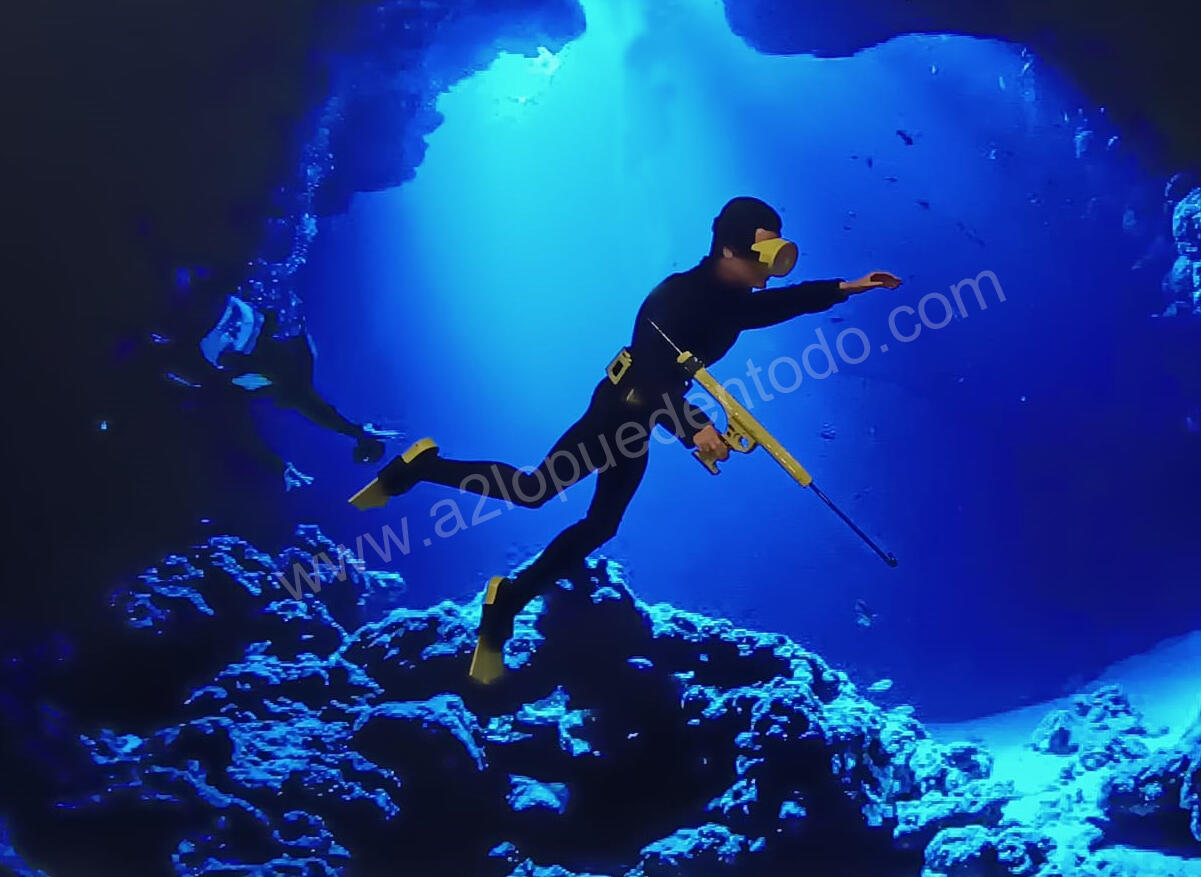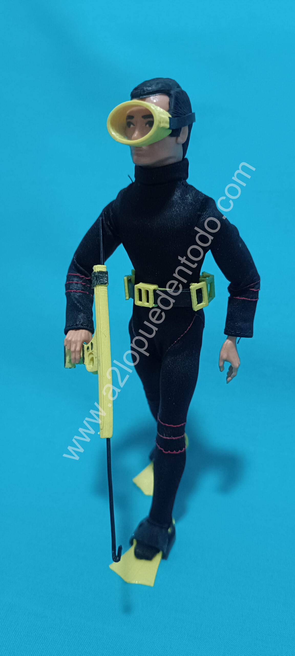 Gafas, arpón, aletas y cinturón realizados en 3D.
