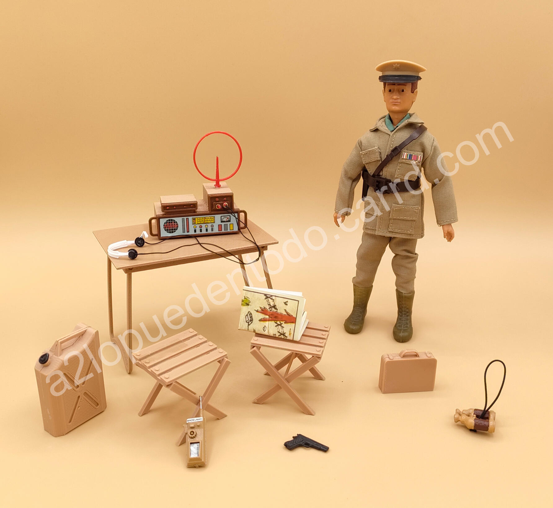 - Radio, bidón, mesa, sillas, maletín impresos en 3D.