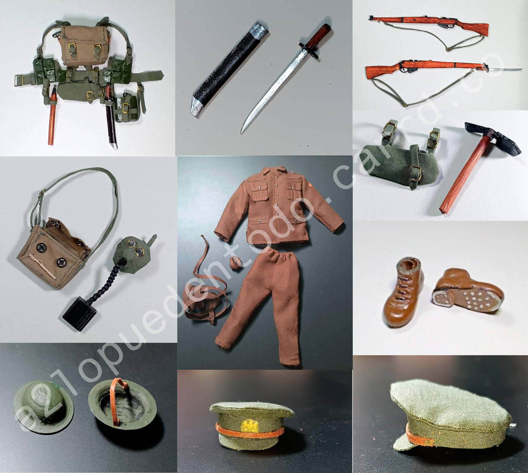 Ropa cosida a medida sobre maniquí reinyectado. Botas, walkie talkie, cetme y prismáticos reinyectados. Gorra y garfio con cuerda Altaya.