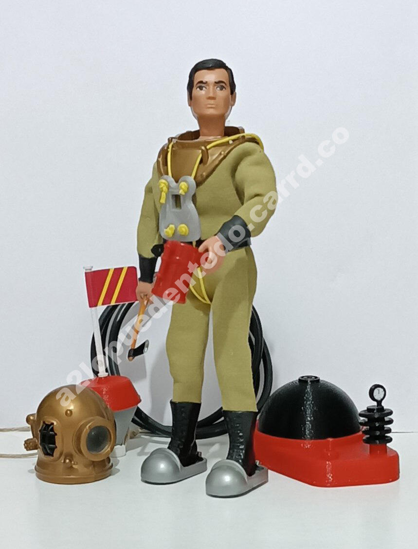 Traje cosido a medida sobre maniquí Altaya con cabeza reinyectada. Complementos altaya. Boya, pesas y bomba diseñadas y realizadas con impresora 3D.
